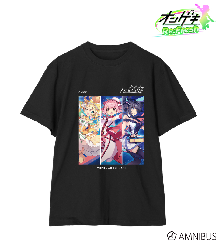 星咲 あかり、藤沢 柚子、三角 葵のイラスト、ユニットのロゴをTシャツに仕上げました。