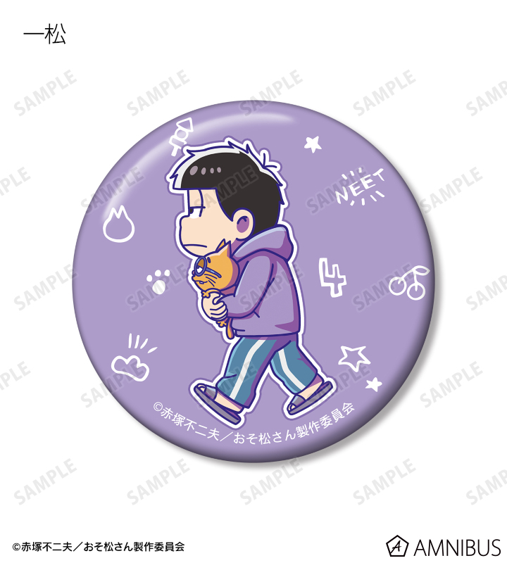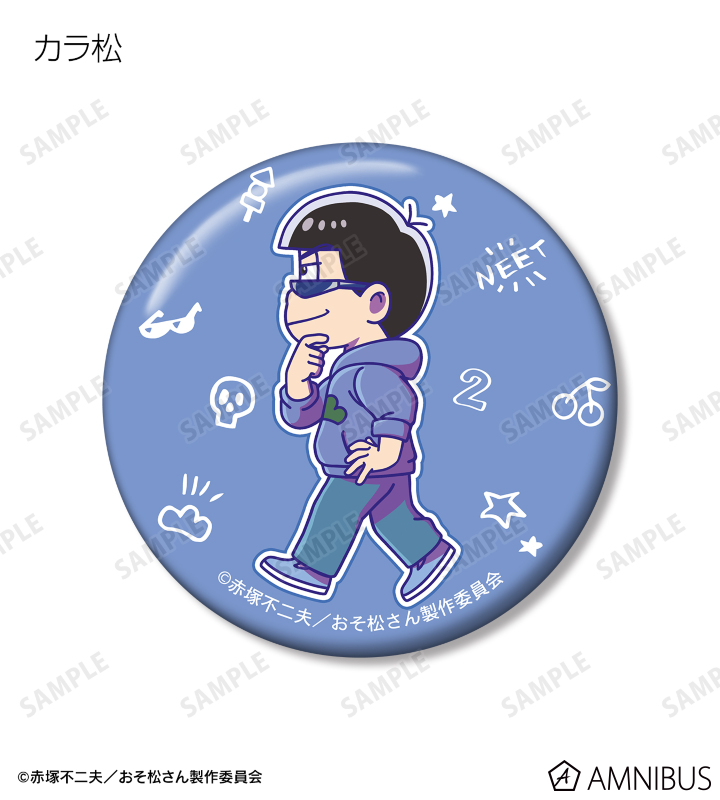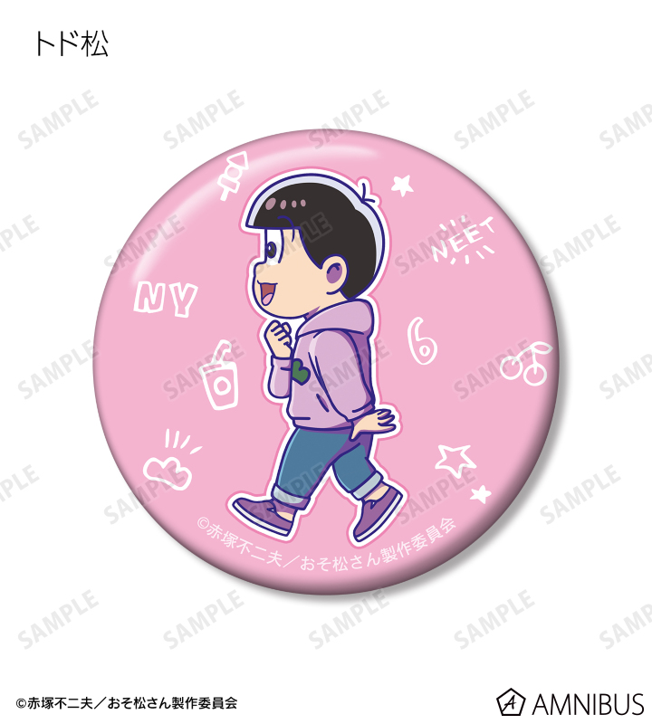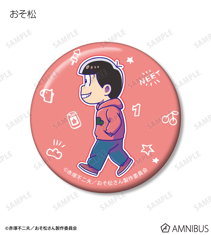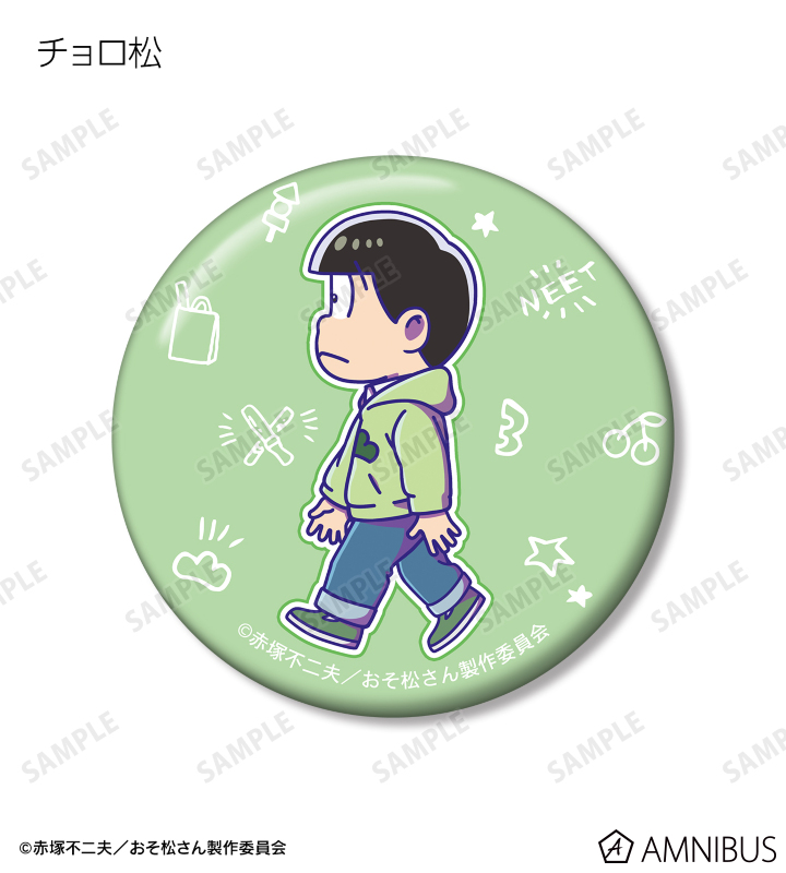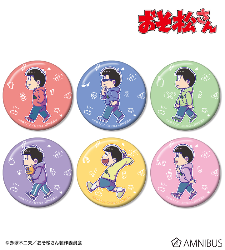 おそ松、カラ松、チョロ松、一松、十四松、トド松が歩いているちびキャラを新たに描き起こし、キャラクターモチーフをデザインした缶バッジ6個セットに仕上げました。
