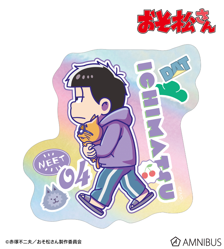 一松が歩いているちびキャラを新たに描き起こし、キャラクターモチーフをデザインしたオーロラステッカーに仕上げました。
