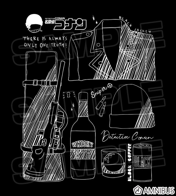 赤井秀一からイメージしたライフル、ウイスキーボトル、ニット帽などのモチーフをラフなタッチで表現し、背面に大きくレイアウトしました。