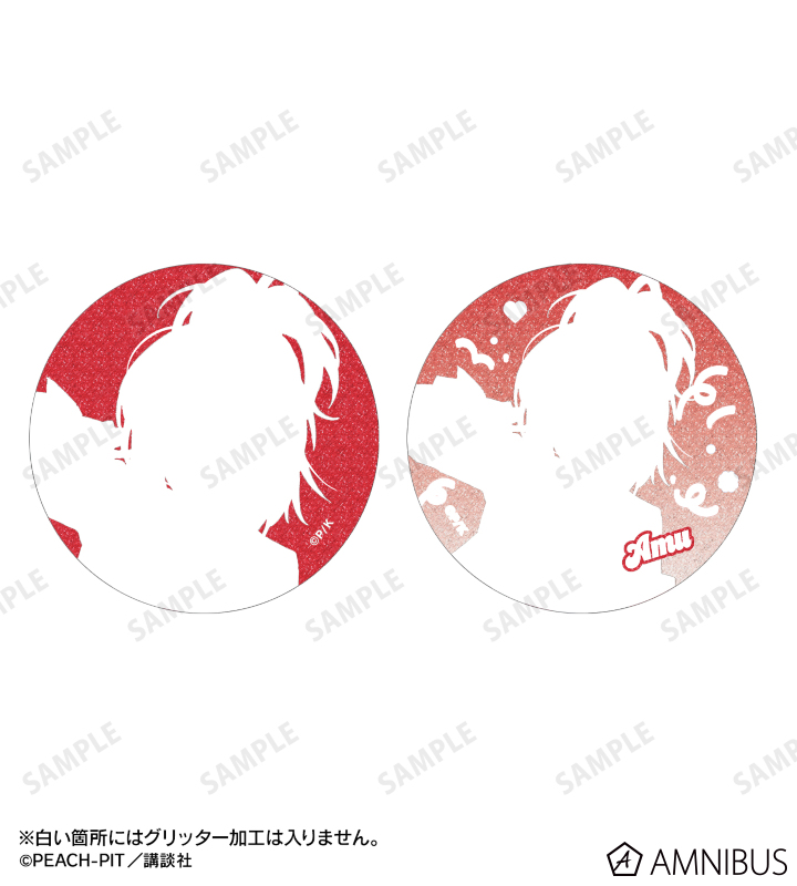 popman3580さん描き下ろしイラストの日奈森 あむ、月詠 イクト、辺里 唯世、藤咲 なぎひこ、ほしな 歌唄をグリッター加工を施した缶バッジに仕上げました。