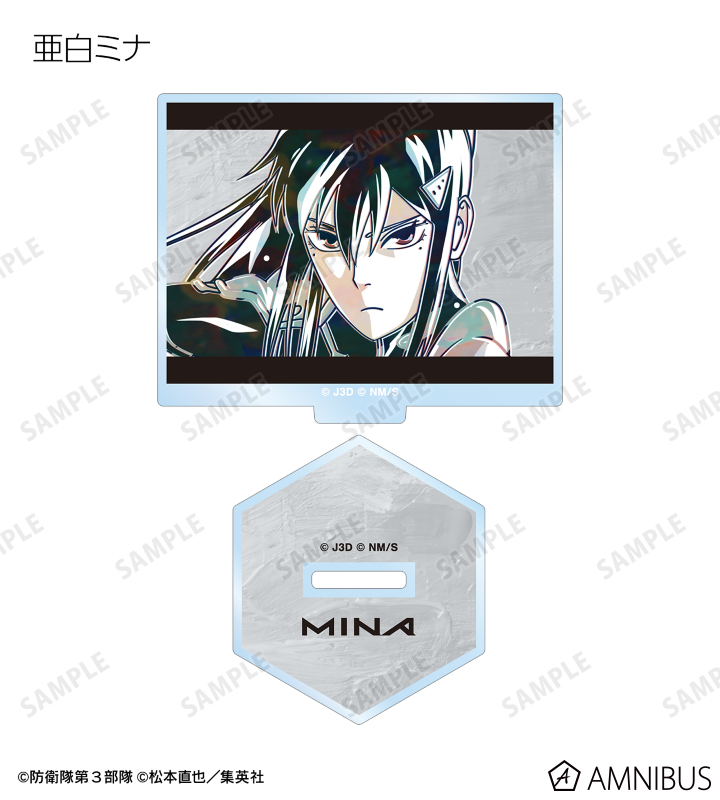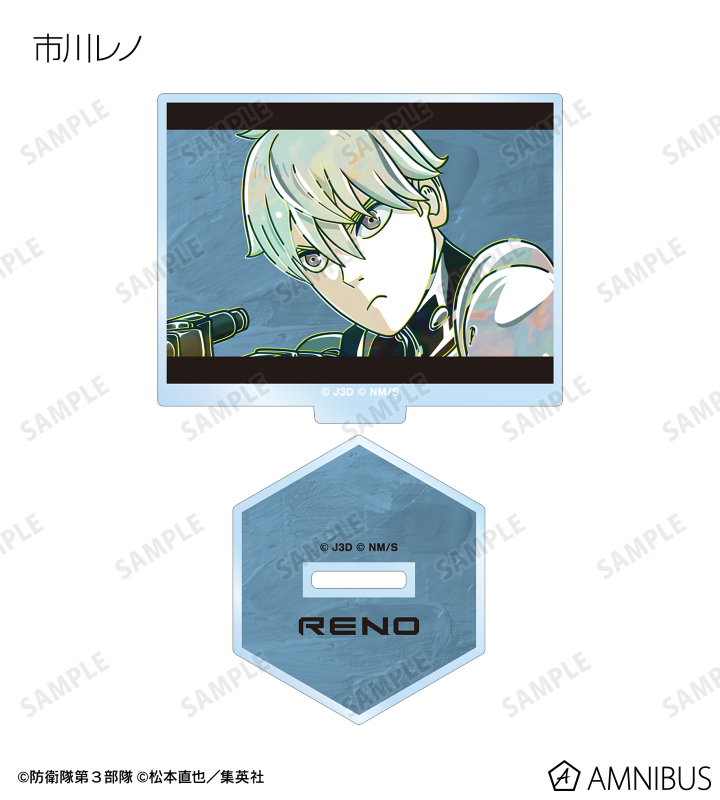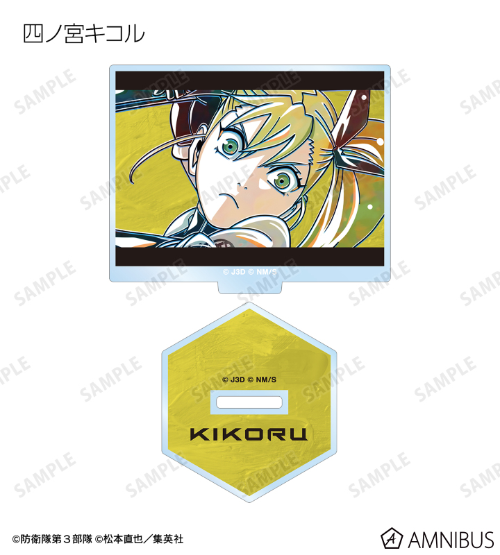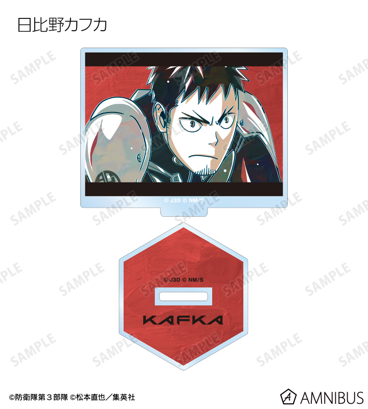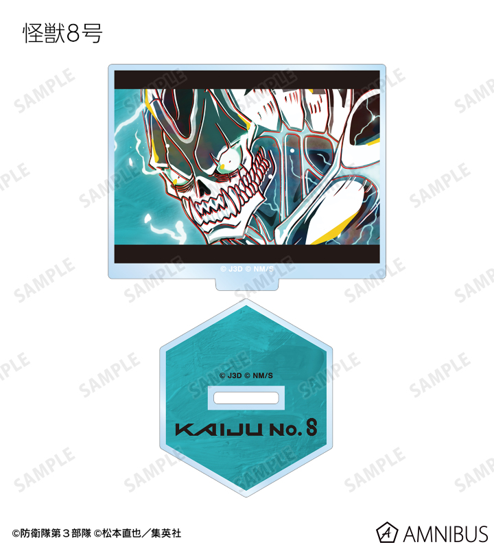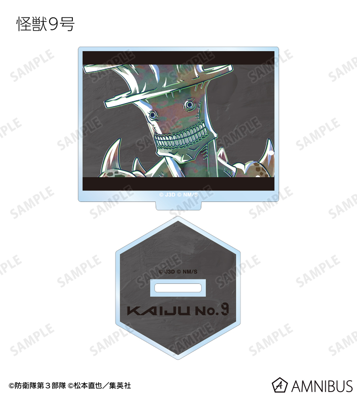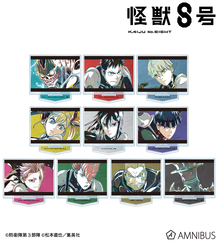 怪獣8号、日比野カフカ、市川レノ、四ノ宮キコル、亜白ミナ、保科宗四郎、鳴海弦、古橋伊春、四ノ宮功、怪獣9号のイラストを新たなタッチで魅力的に表現し、アクリルスタンドに仕上げました。
