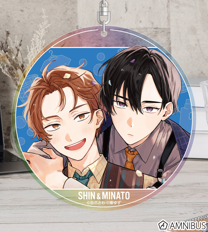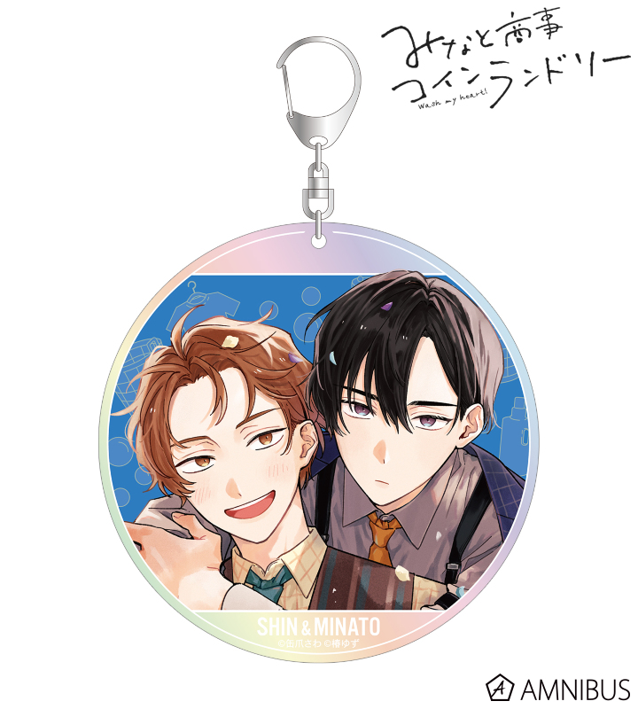 湊 晃、香月 慎太郎のカラーイラスト、ランドリー店をイメージしたモチーフをオーロラBIGアクリルキーホルダーに仕上げました。