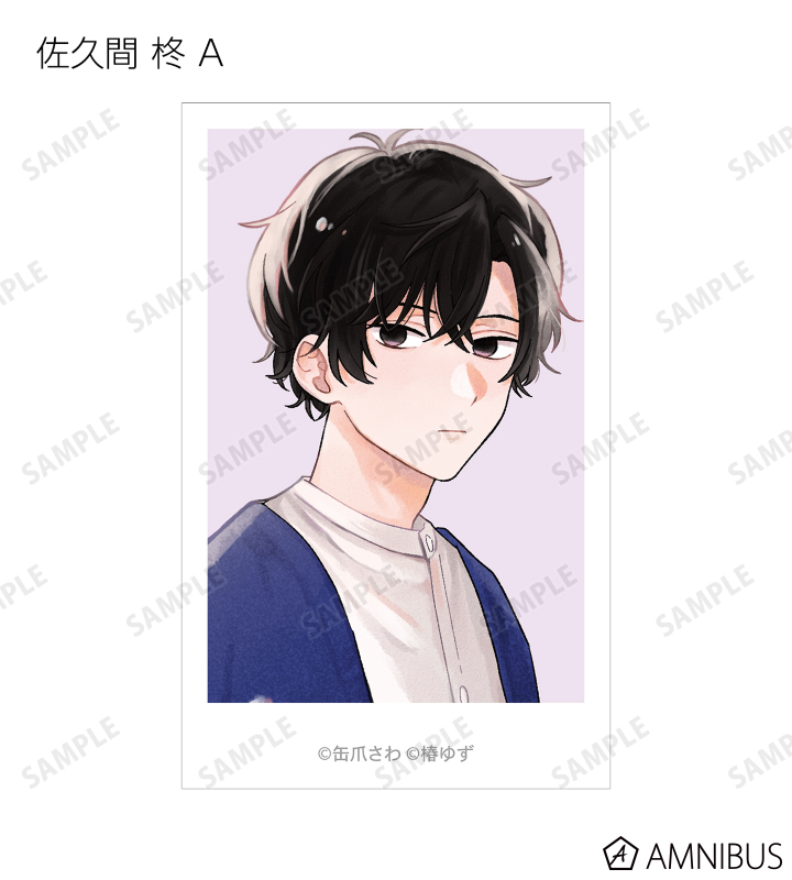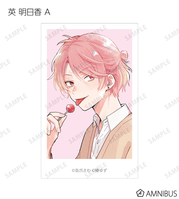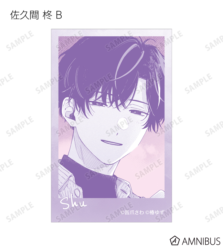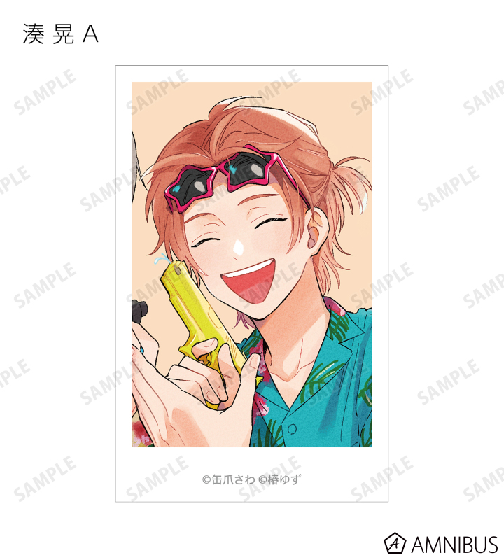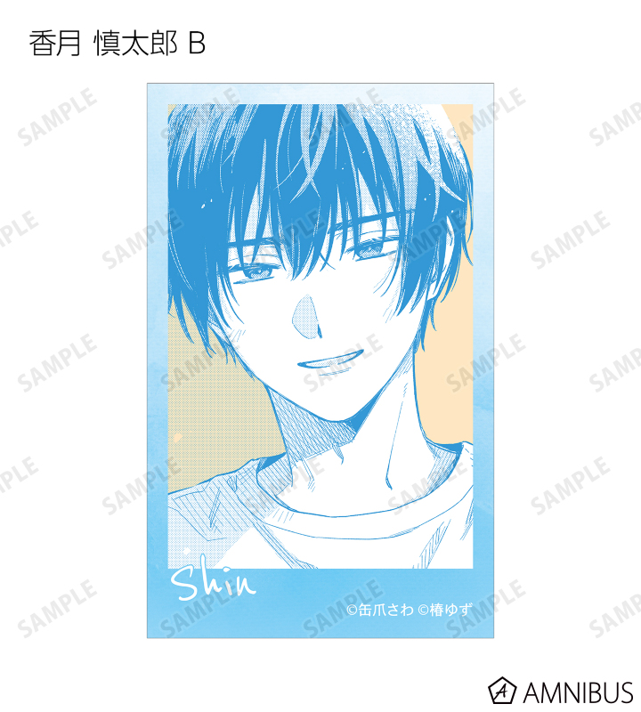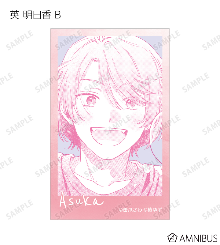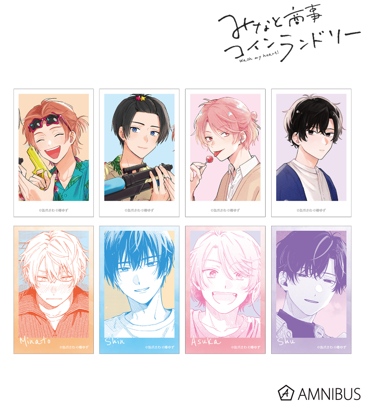 湊 晃、香月 慎太郎、英 明日香、佐久間 柊のカラーイラスト、原作コマをインスタントカメラ風のイラストカードに仕上げました。