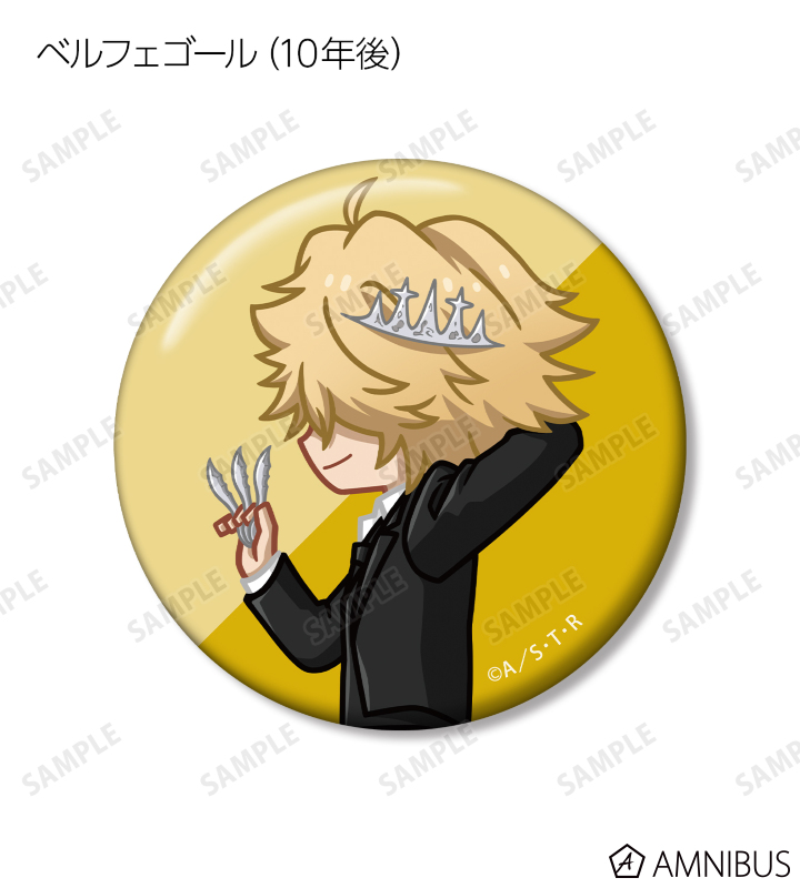リボーン、沢田 綱吉、雲雀 恭弥(10年後)、六道 骸(10年後)、XANXUS(10年後)、スペルビ・スクアーロ(10年後)、ベルフェゴール(10年後)、フランが歩いているちびキャラを新たに描き起こし、缶バッジに仕上げました。