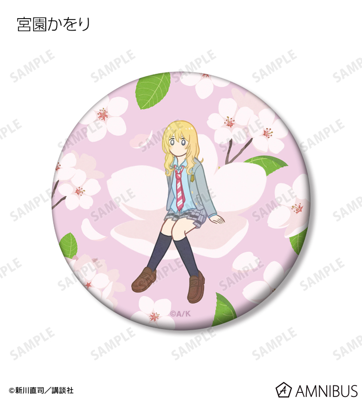 有馬公生、宮園かをり、澤部椿、渡亮太、相座武士、井川絵見、相座凪のイラストをボタニカルデザインに落とし込んで繊細なタッチで新たに描き起こし、マットな手触りの缶バッジに仕上げました。
