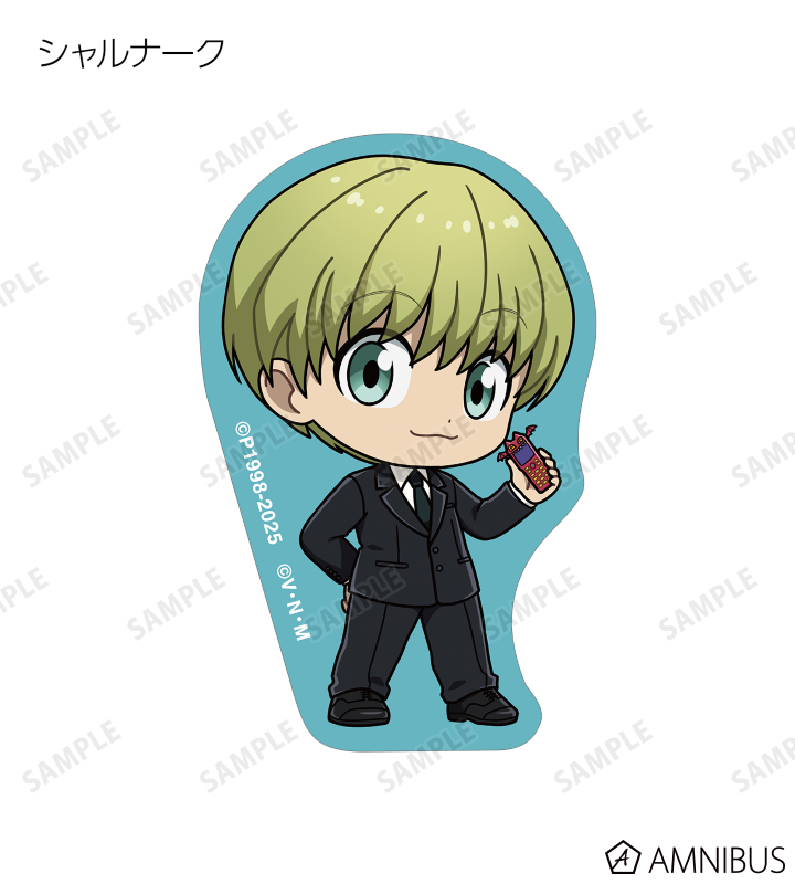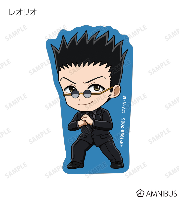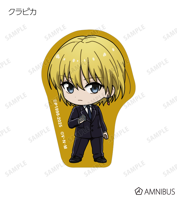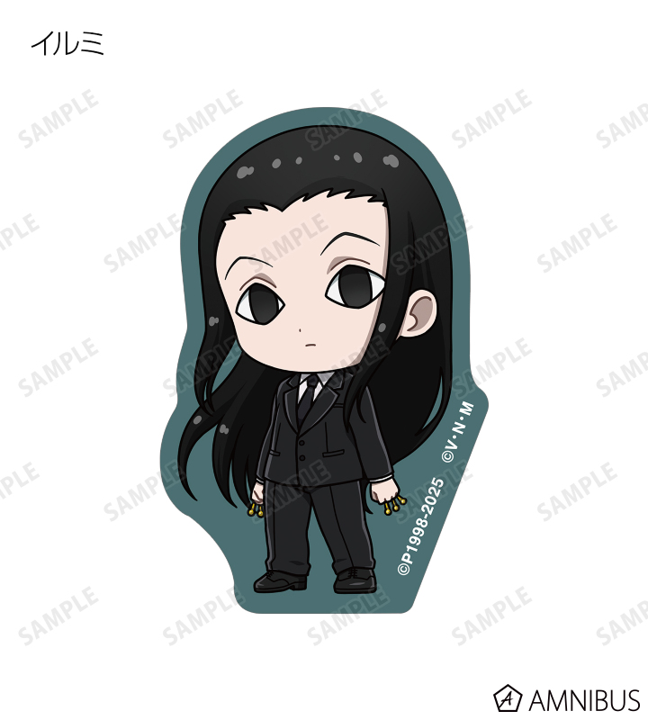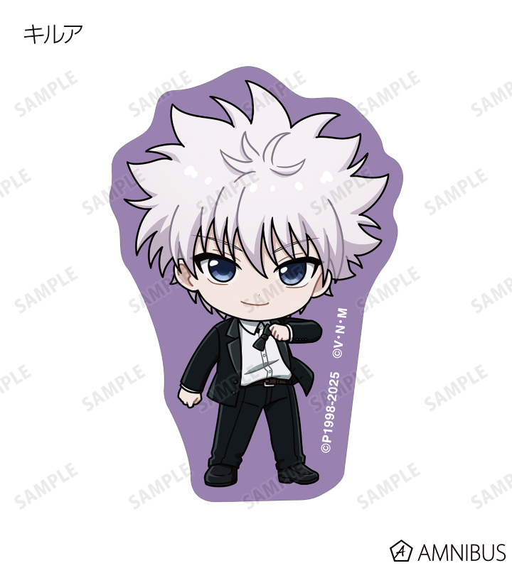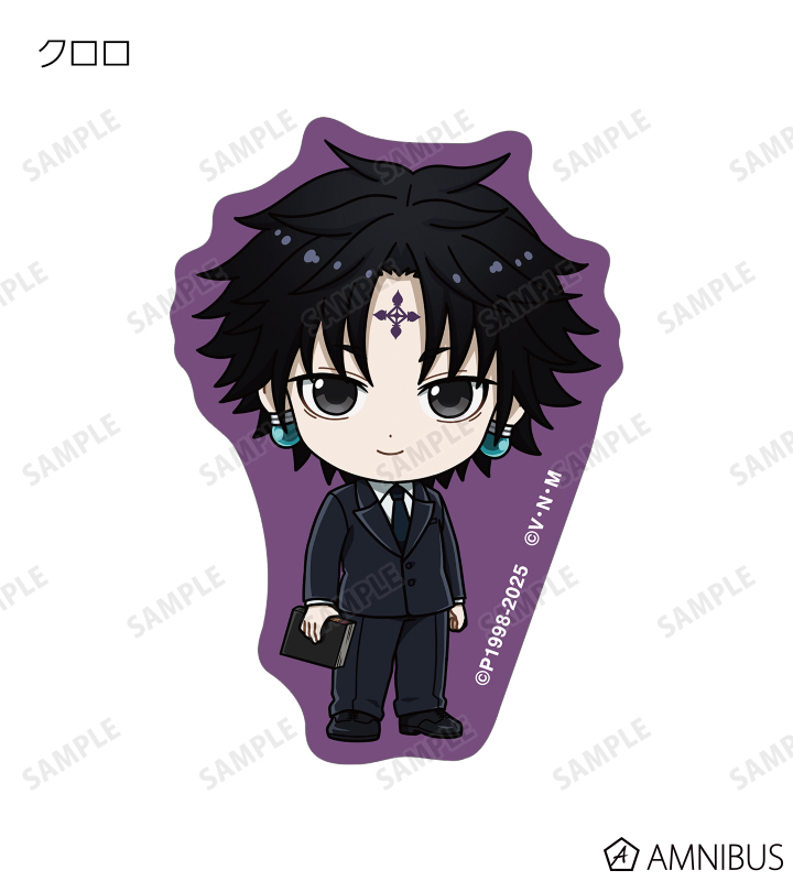 ゴン、キルア、レオリオ、クラピカ、クロロ、シャルナーク、フェイタン、ヒソカ、イルミの描き起こしちびキャライラストをメインにデザインし、ダイカットのステッカーに仕上げました。