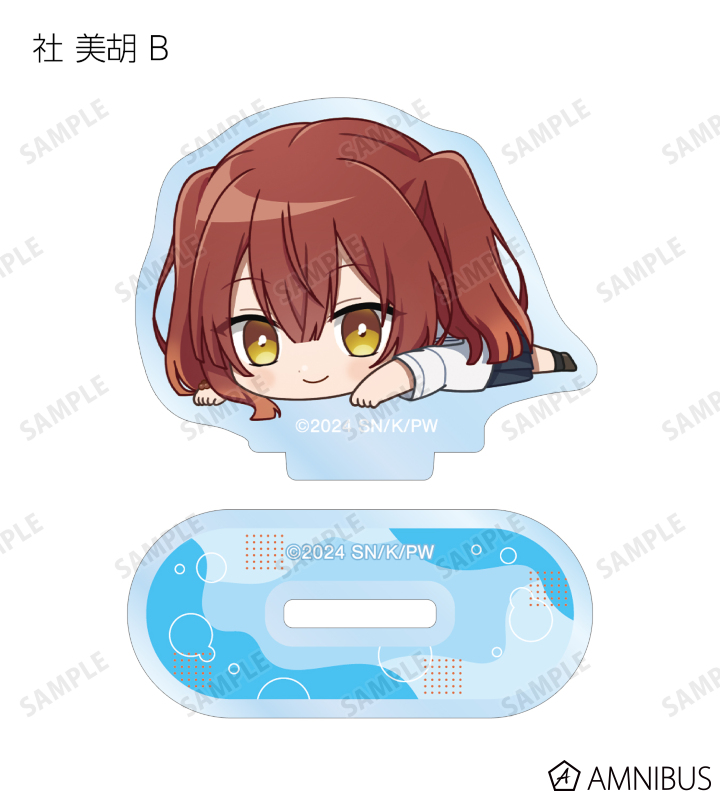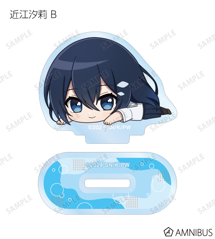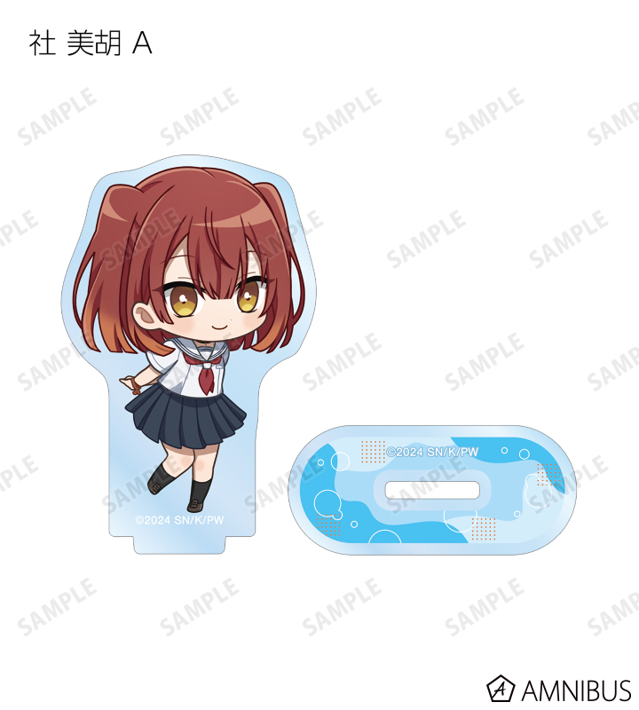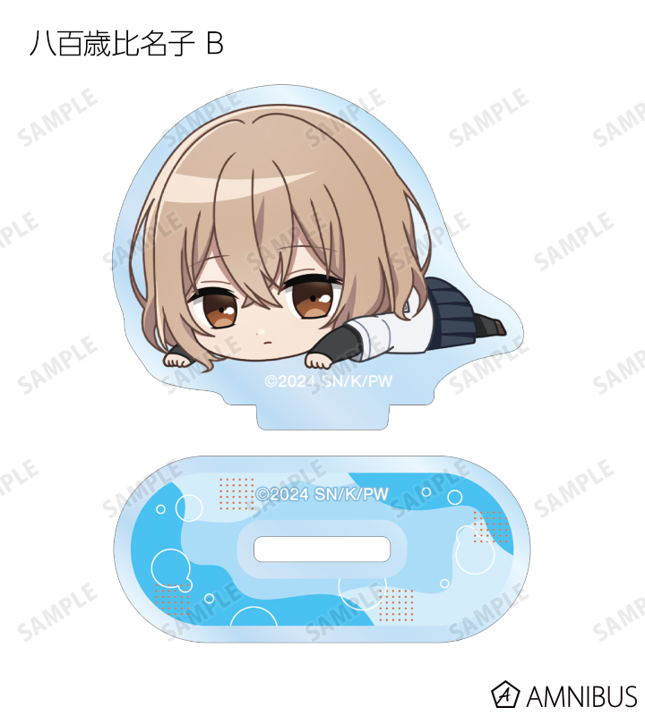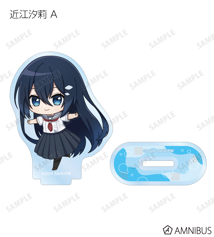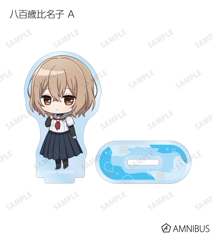 八百歳比名子、近江汐莉、社 美胡のちびキャライラストをメインにデザインし、アクリルスタンドに仕上げました。