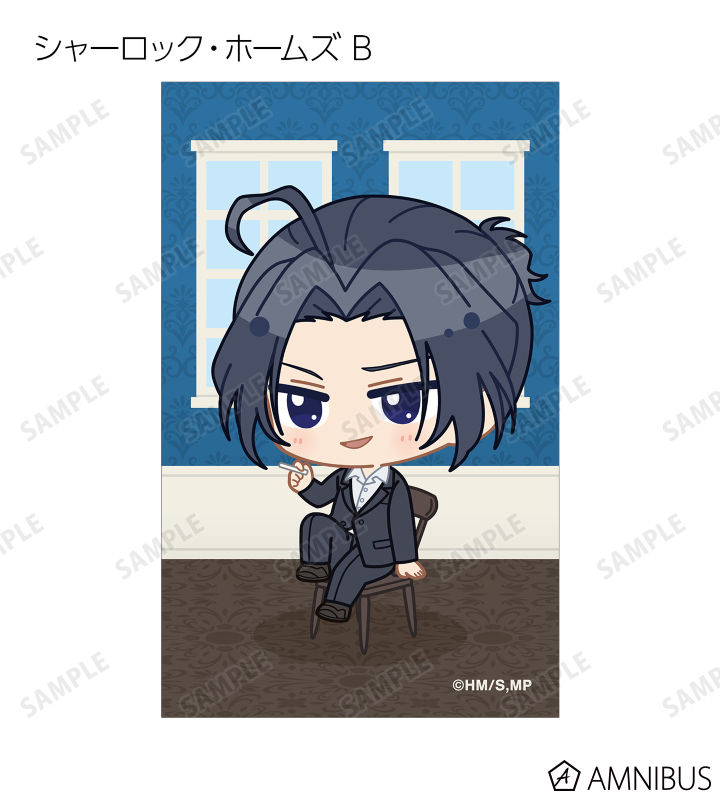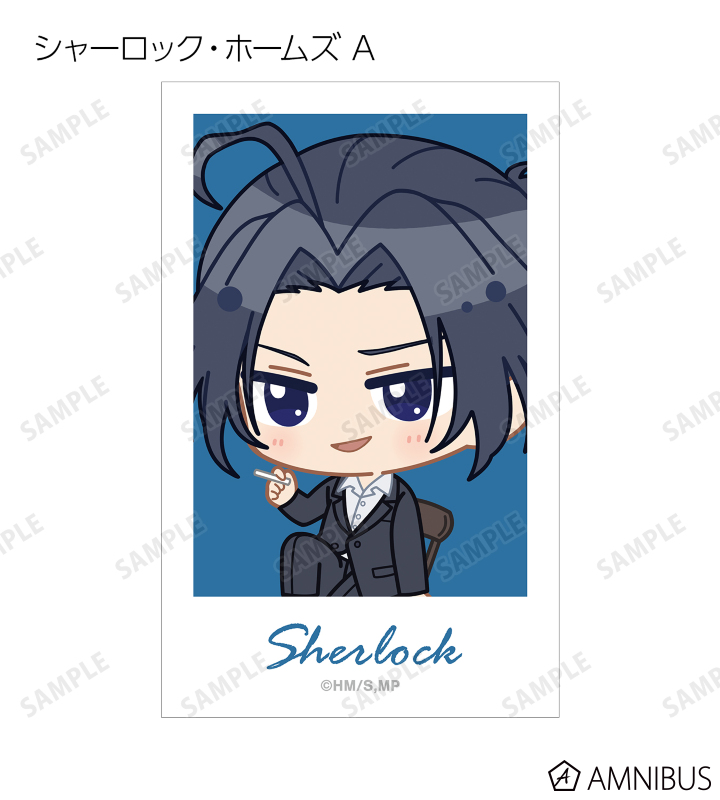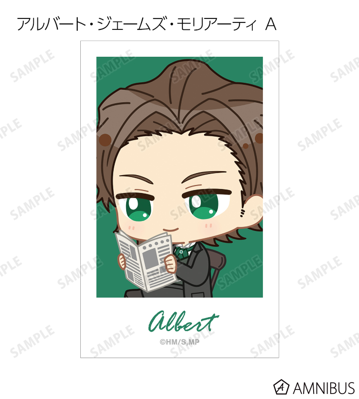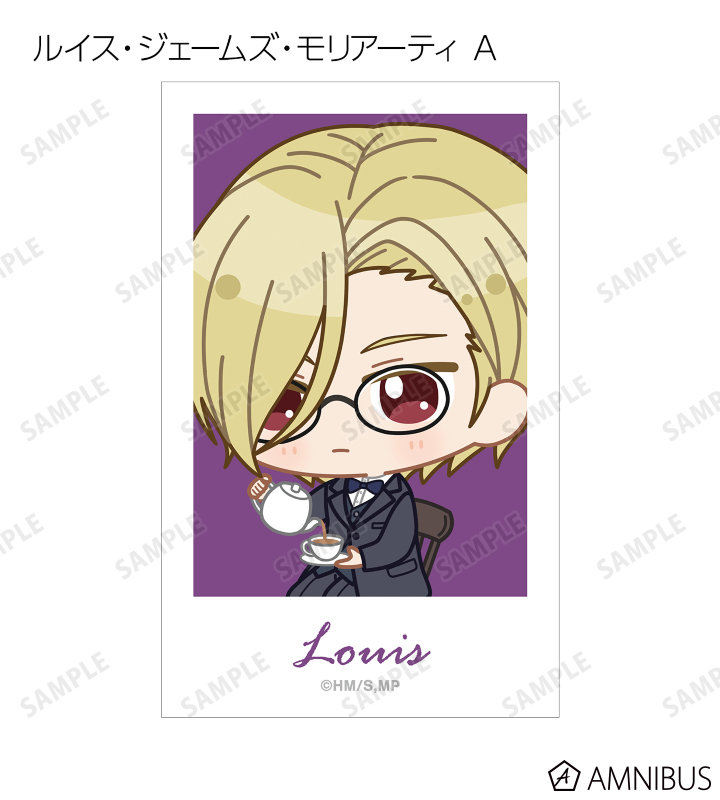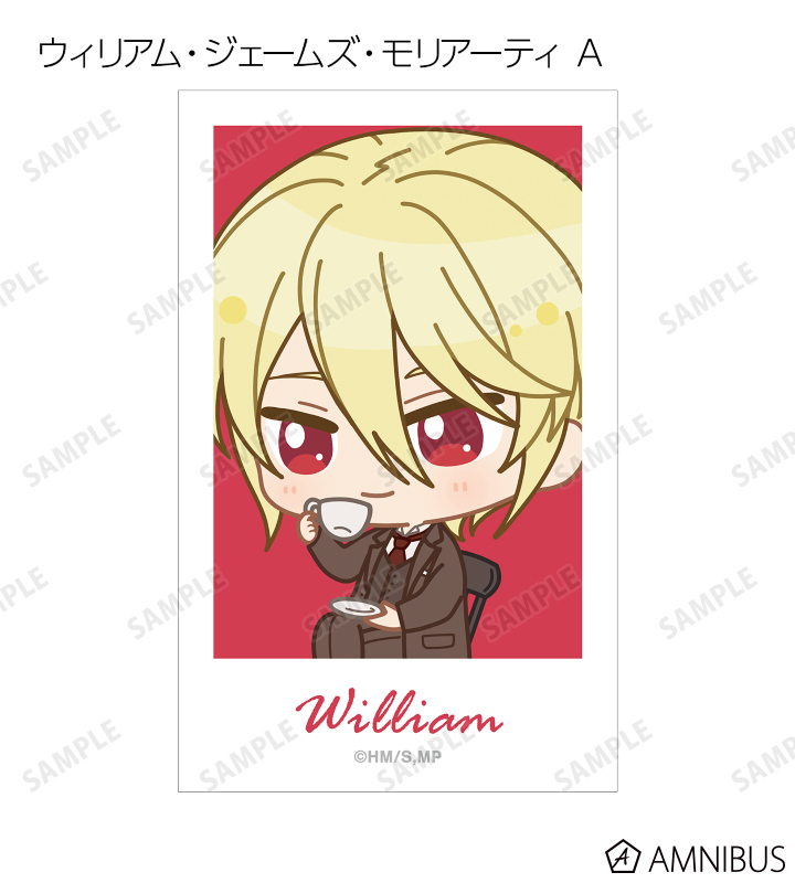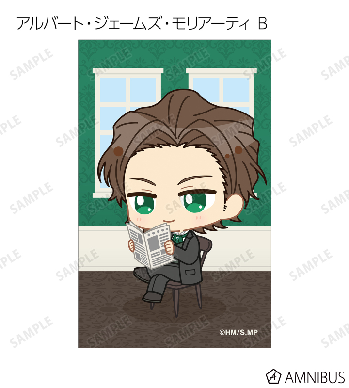 ウィリアム・ジェームズ・モリアーティ、アルバート・ジェームズ・モリアーティ、ルイス・ジェームズ・モリアーティ、セバスチャン・モラン、フレッド・ポーロック、ジェームズ・ボンド、シャーロック・ホームズ、ジョン・H・ワトソン、マイクロフト・ホームズの描き起こしちびキャライラストをメインにデザインし、イラストカードに仕上げました。