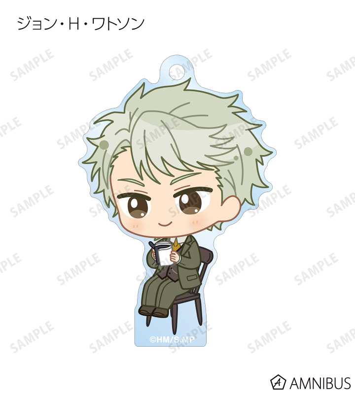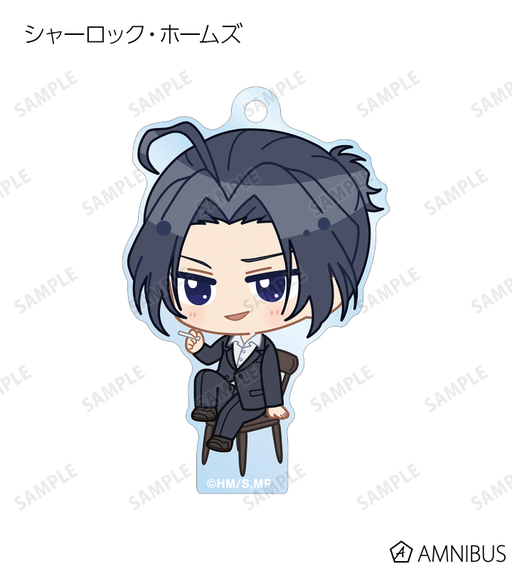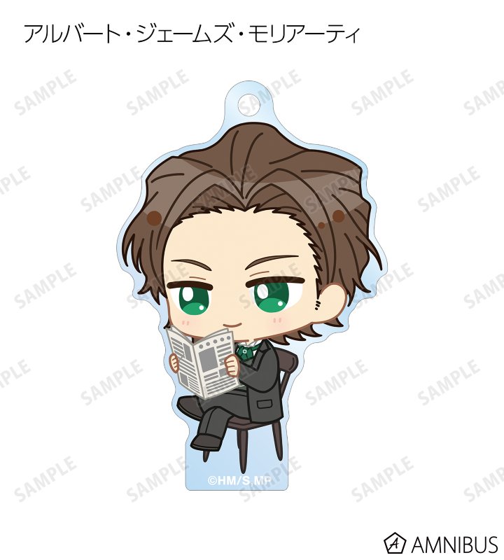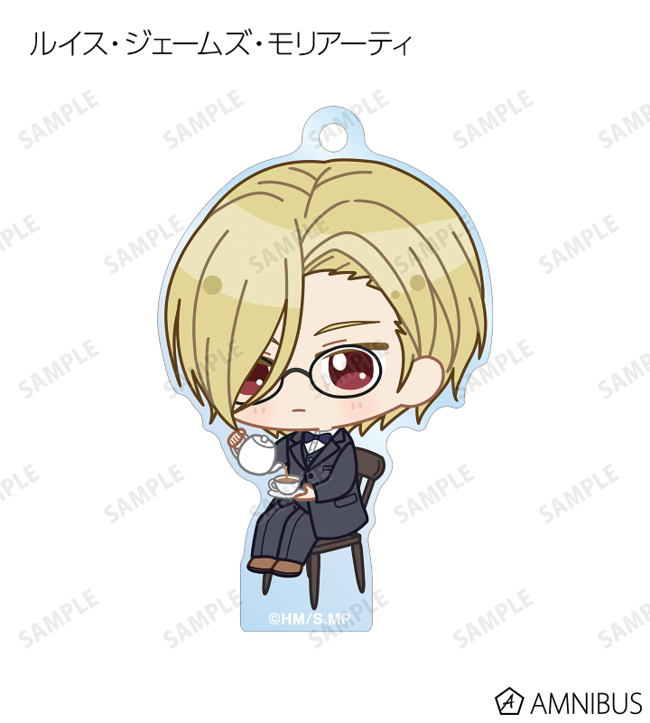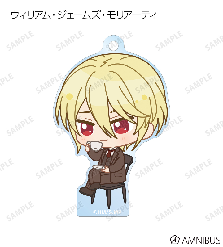 ウィリアム・ジェームズ・モリアーティ、アルバート・ジェームズ・モリアーティ、ルイス・ジェームズ・モリアーティ、セバスチャン・モラン、フレッド・ポーロック、ジェームズ・ボンド、シャーロック・ホームズ、ジョン・H・ワトソン、マイクロフト・ホームズの描き起こしちびキャライラストをメインにデザインし、アクリルキーホルダーに仕上げました。