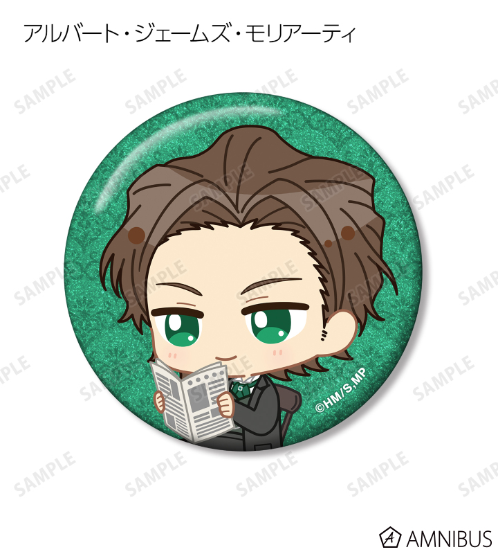 ウィリアム・ジェームズ・モリアーティ、アルバート・ジェームズ・モリアーティ、ルイス・ジェームズ・モリアーティ、セバスチャン・モラン、フレッド・ポーロック、ジェームズ・ボンド、シャーロック・ホームズ、ジョン・H・ワトソン、マイクロフト・ホームズの描き起こしちびキャライラストをメインにデザインし、グリッター加工を施した缶バッジに仕上げました。
