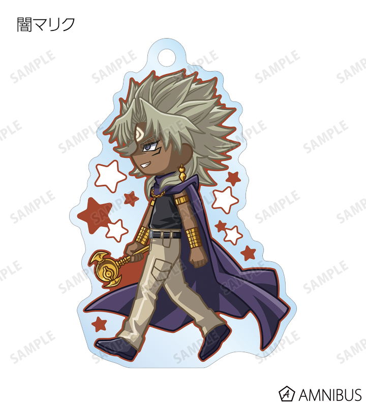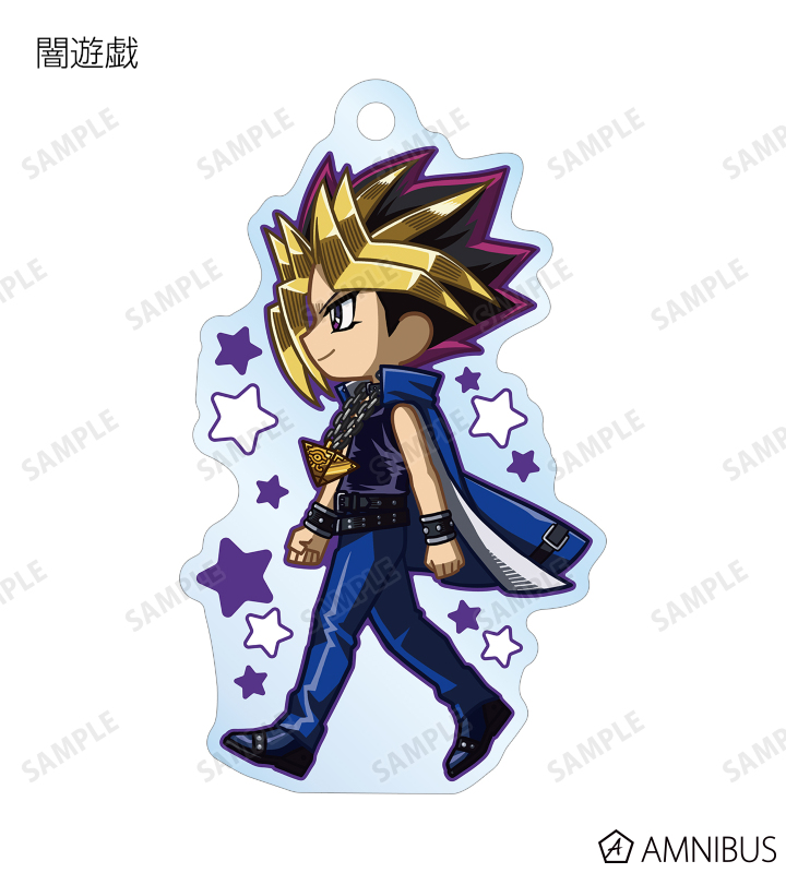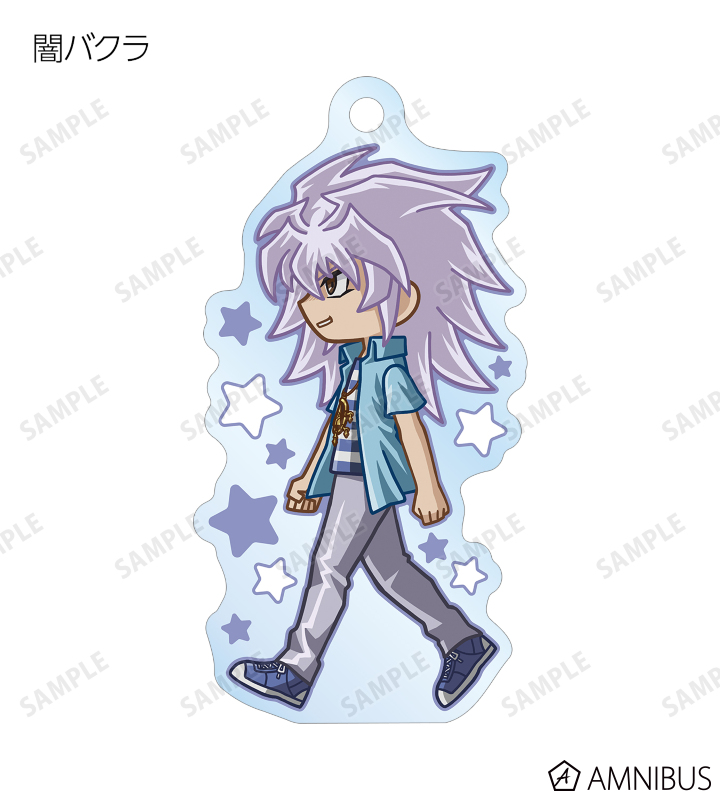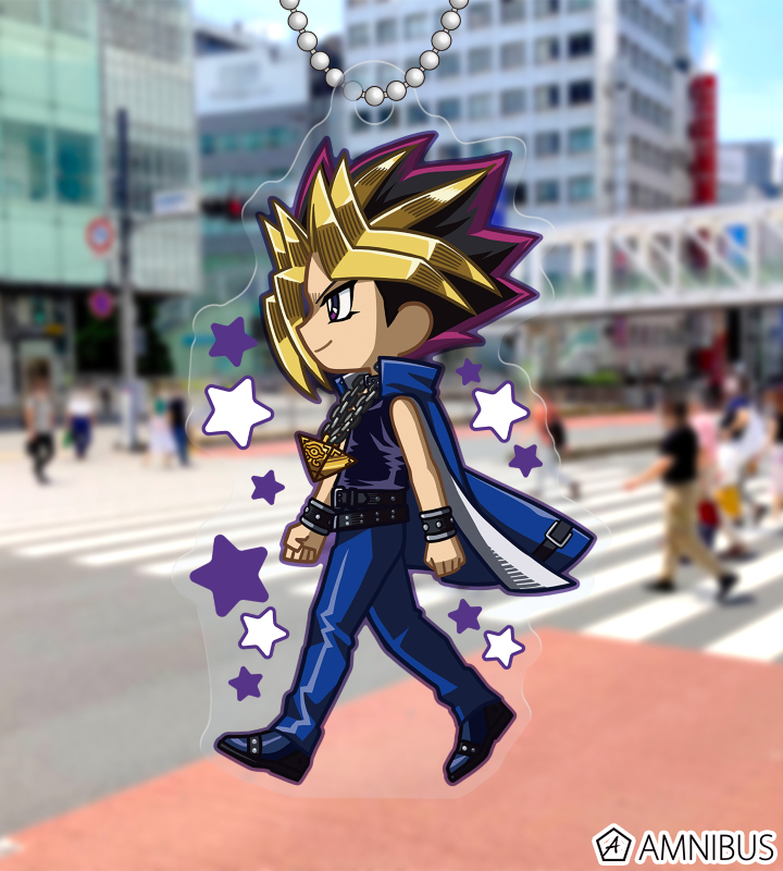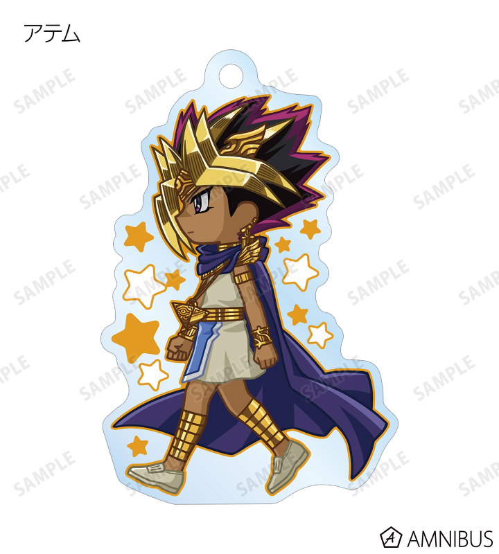 闇遊戯、武藤遊戯、海馬瀬人、城之内克也、闇マリク、闇バクラ、盗賊王バクラ、アテム、セト、ブラック・マジシャン、ブラック・マジシャン・ガール、キサラ、マハード、マナが歩いているちびキャラを新たに描き起こし、アクリルキーホルダーに仕上げました。