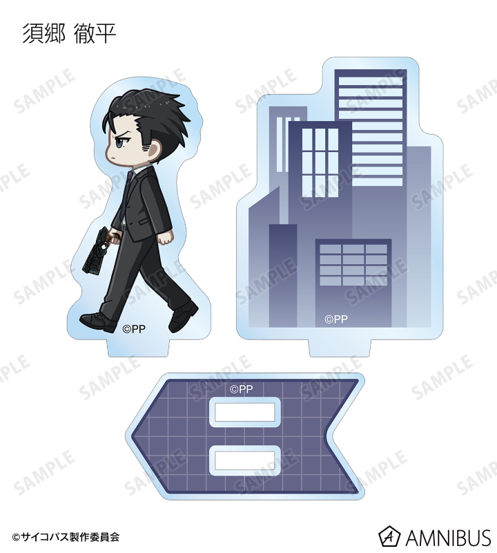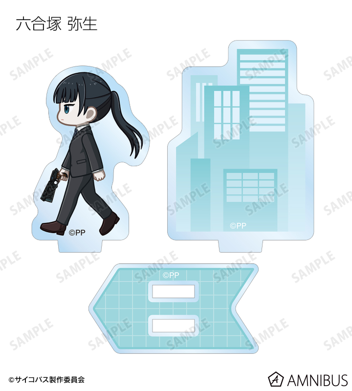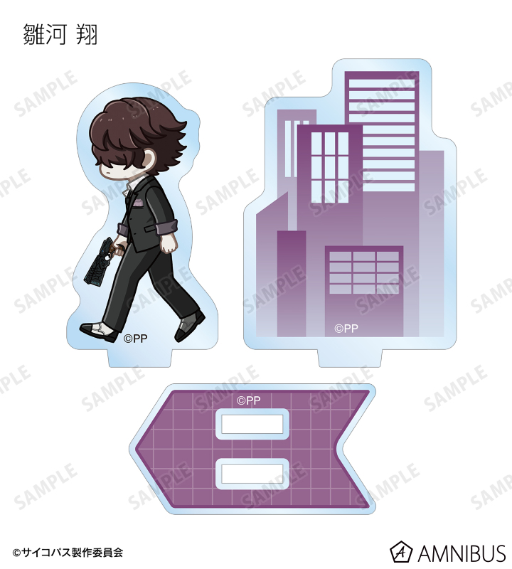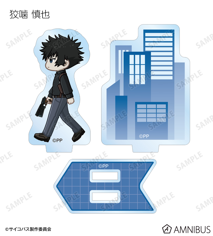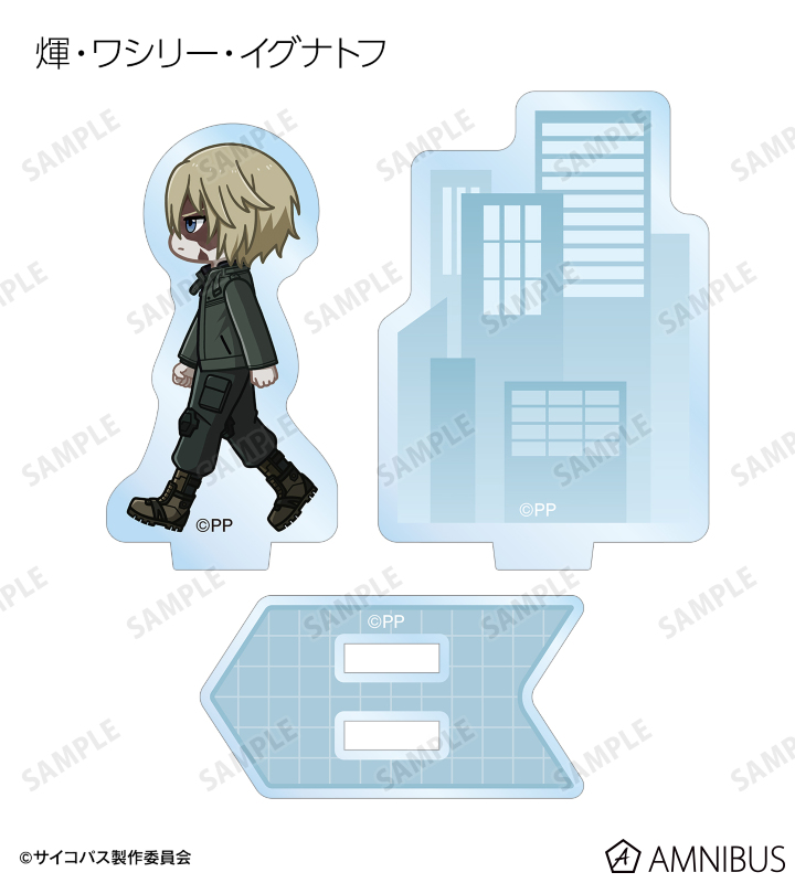 常守 朱、狡噛 慎也、宜野座 伸元、六合塚 弥生、唐之杜 志恩、霜月 美佳、雛河 翔、須郷 徹平、花城 フレデリカ、雑賀 譲二、煇・ワシリー・イグナトフが歩いているちびキャラを新たに描き起こし、パーツ付きのアクリルスタンドに仕上げました。