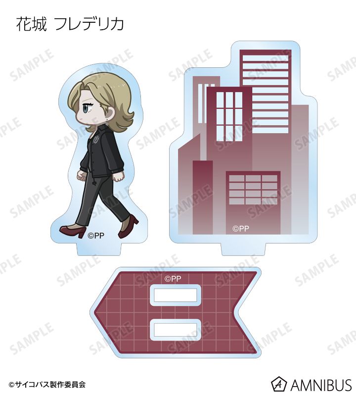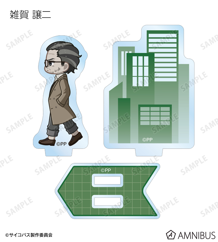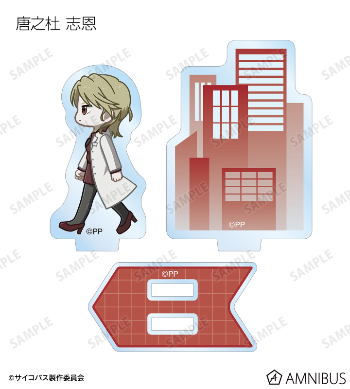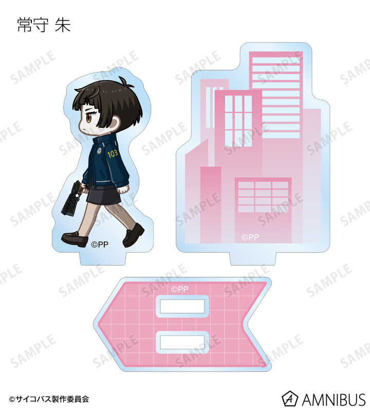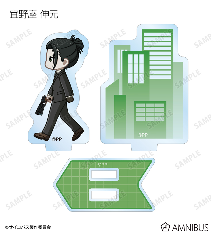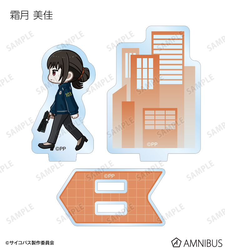 常守 朱、狡噛 慎也、宜野座 伸元、六合塚 弥生、唐之杜 志恩、霜月 美佳、雛河 翔、須郷 徹平、花城 フレデリカ、雑賀 譲二、煇・ワシリー・イグナトフが歩いているちびキャラを新たに描き起こし、パーツ付きのアクリルスタンドに仕上げました。