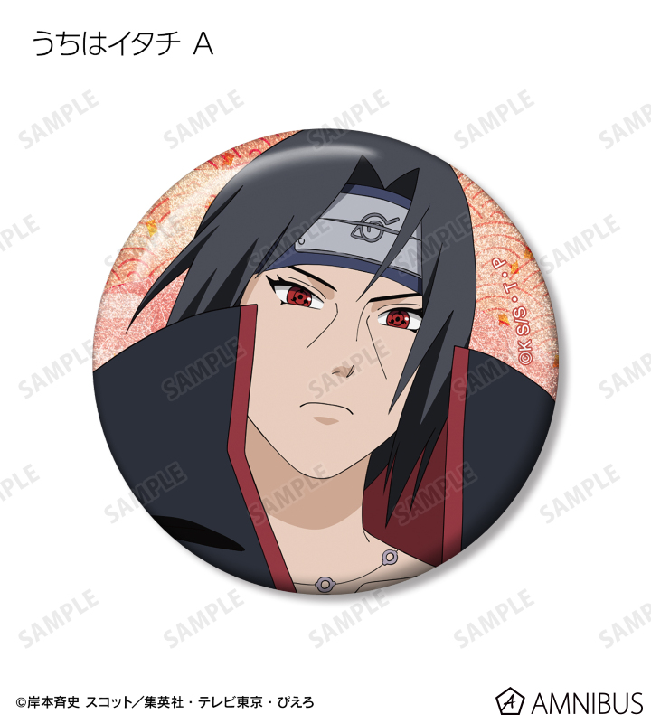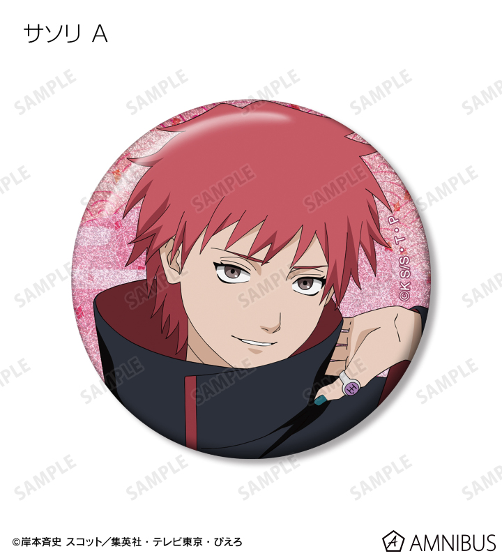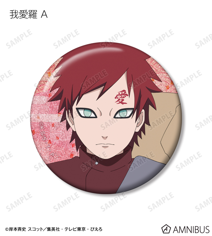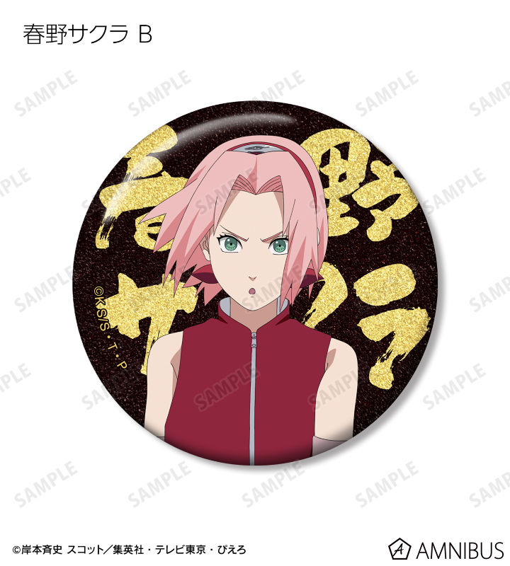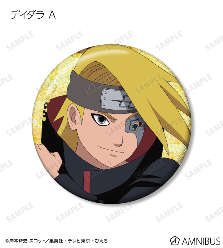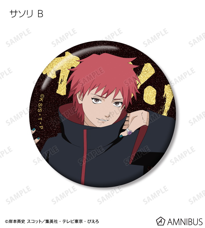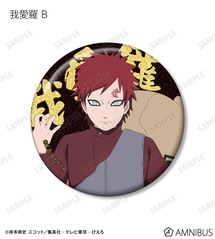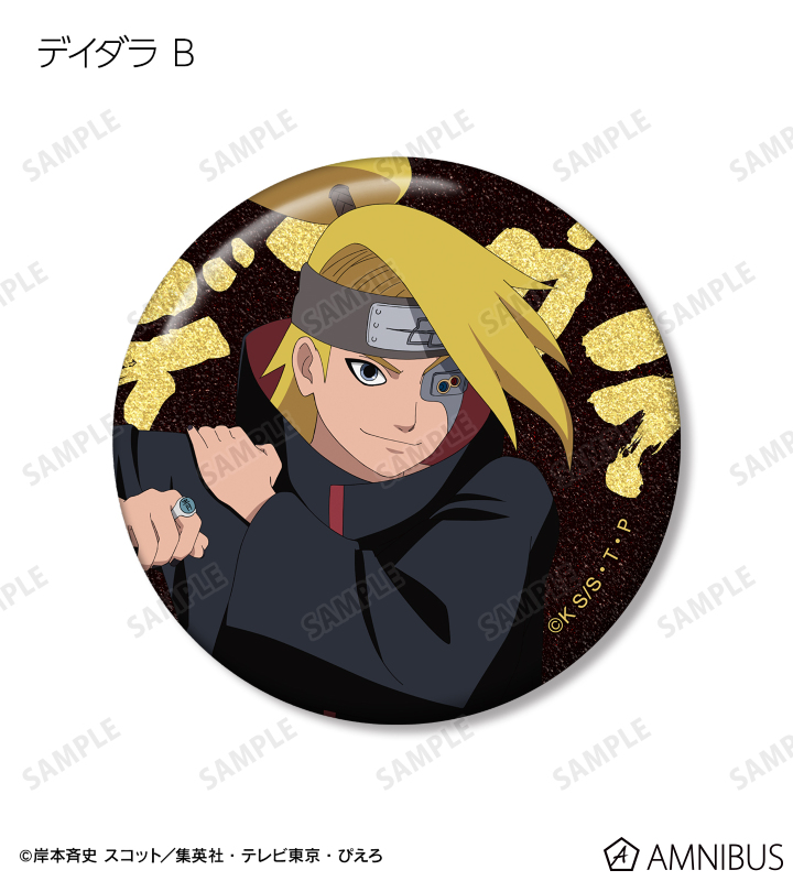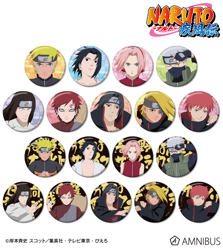 うずまきナルト、うちはサスケ、春野サクラ、はたけカカシ、日向ネジ、我愛羅、うちはイタチ、デイダラ、サソリの描き下ろしイラストをグリッター加工を施した缶バッジに仕上げました。