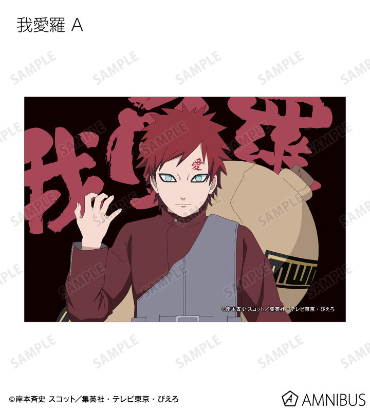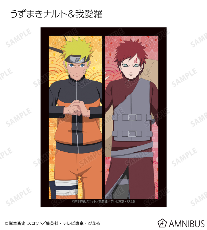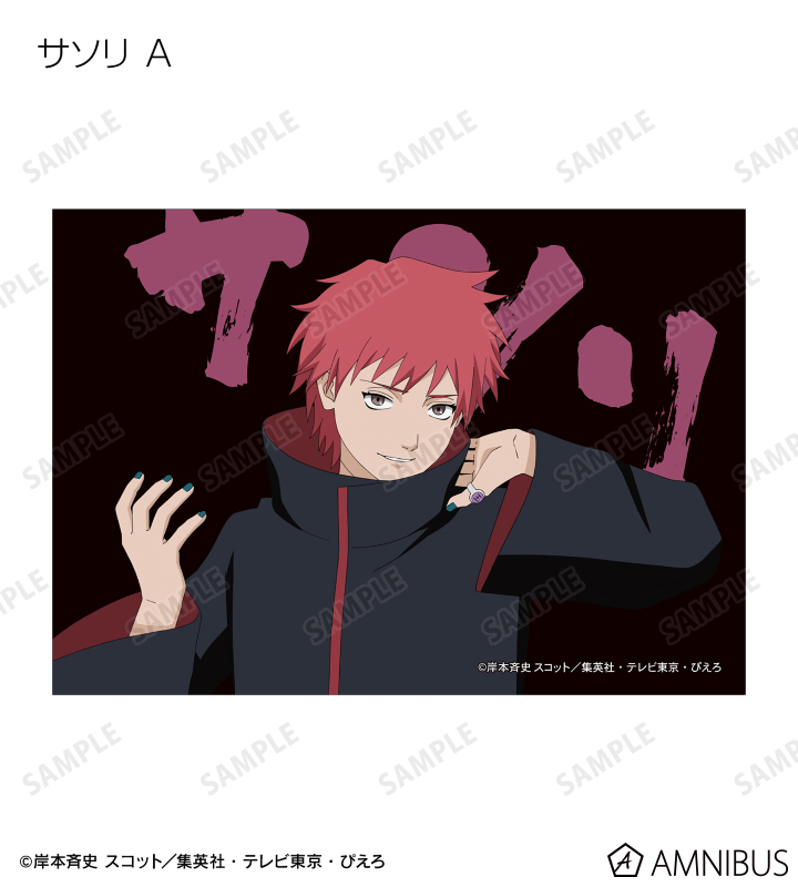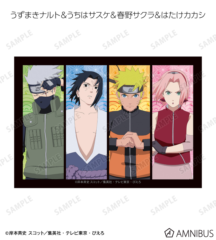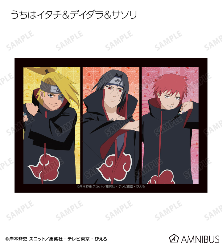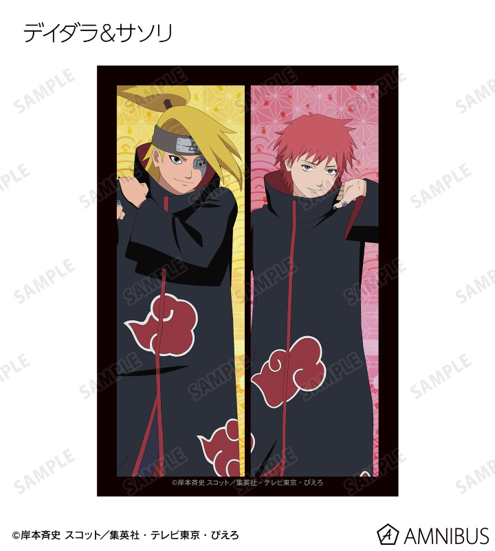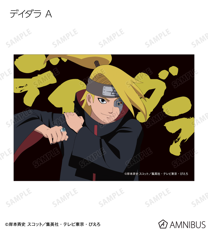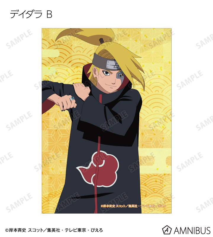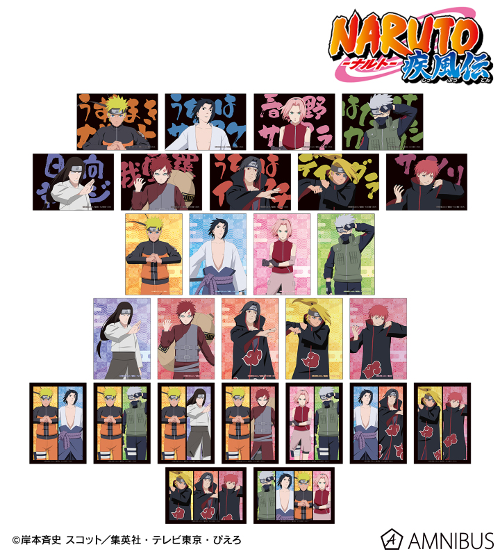 うずまきナルト、うちはサスケ、春野サクラ、はたけカカシ、日向ネジ、我愛羅、うちはイタチ、デイダラ、サソリの描き下ろしイラストをブロマイドに仕上げました。
