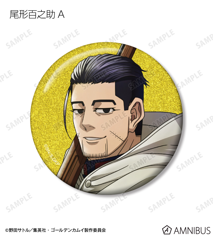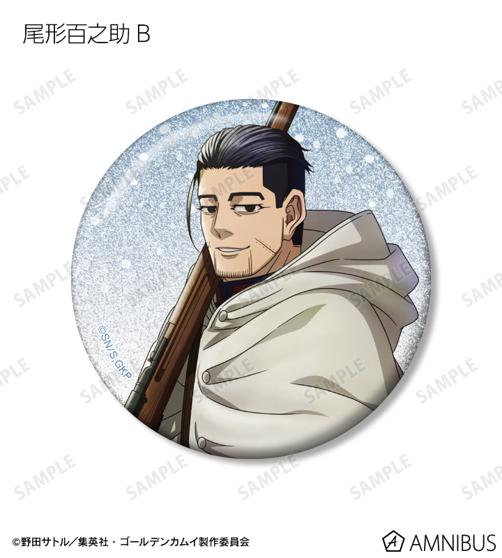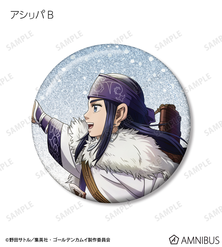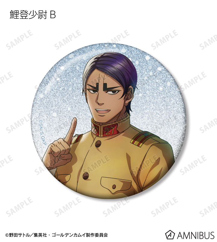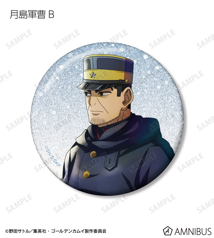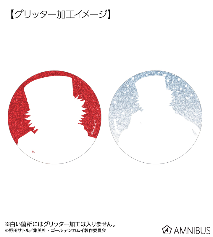 杉元佐一、アシㇼパ、白石由竹、尾形百之助、月島軍曹、鯉登少尉の描き下ろしイラストをグリッター加工を施した缶バッジに仕上げました。