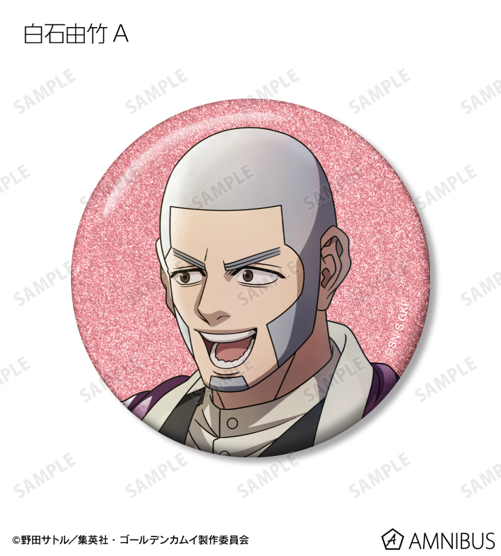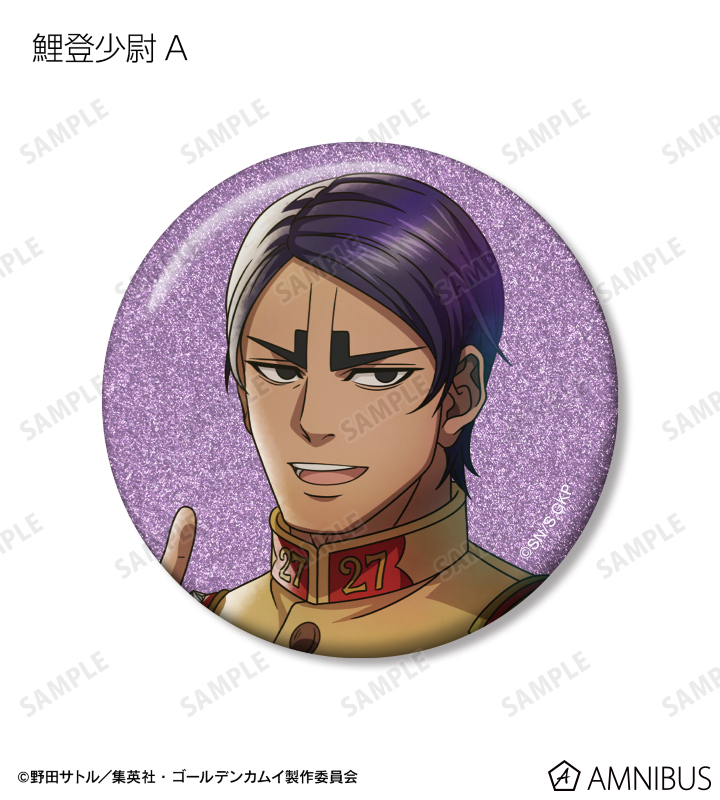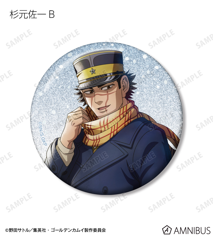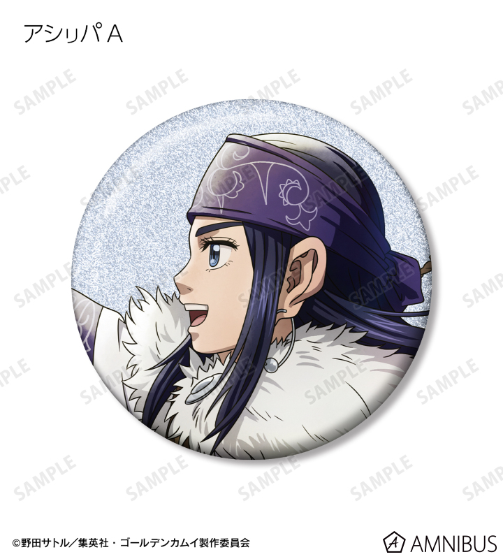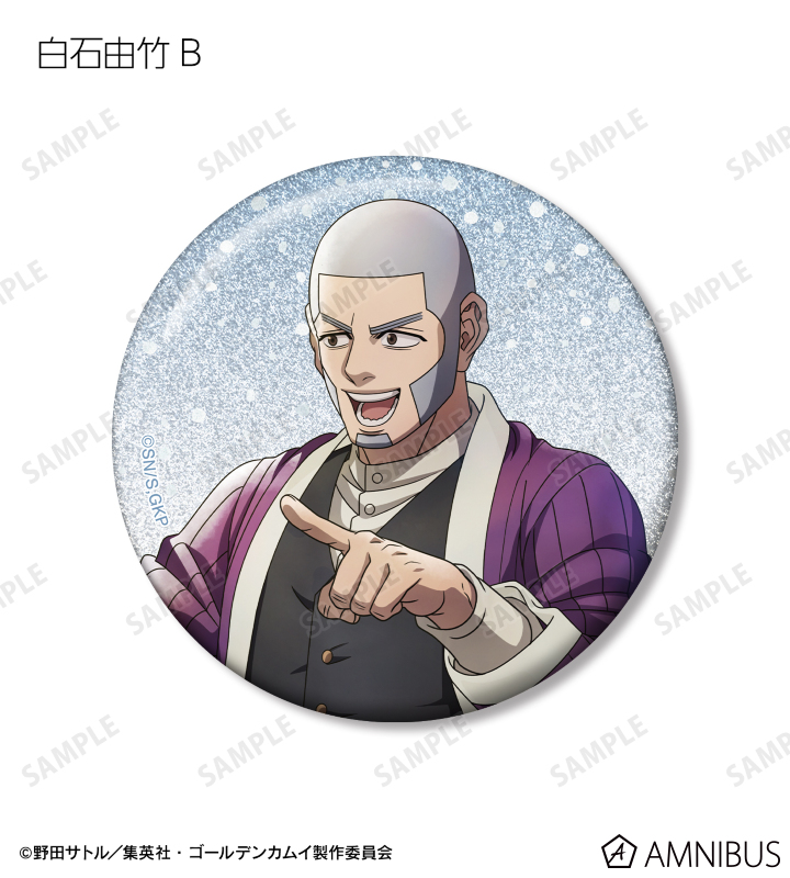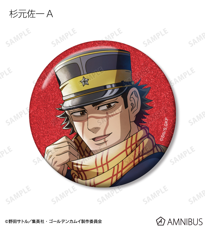 杉元佐一、アシㇼパ、白石由竹、尾形百之助、月島軍曹、鯉登少尉の描き下ろしイラストをグリッター加工を施した缶バッジに仕上げました。