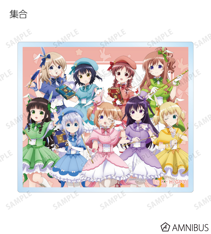 ココア、チノ、リゼ、千夜、シャロ、マヤ、メグ、青山ブルーマウンテン、モカの描き下ろしイラストをアクリルカードに仕上げました。