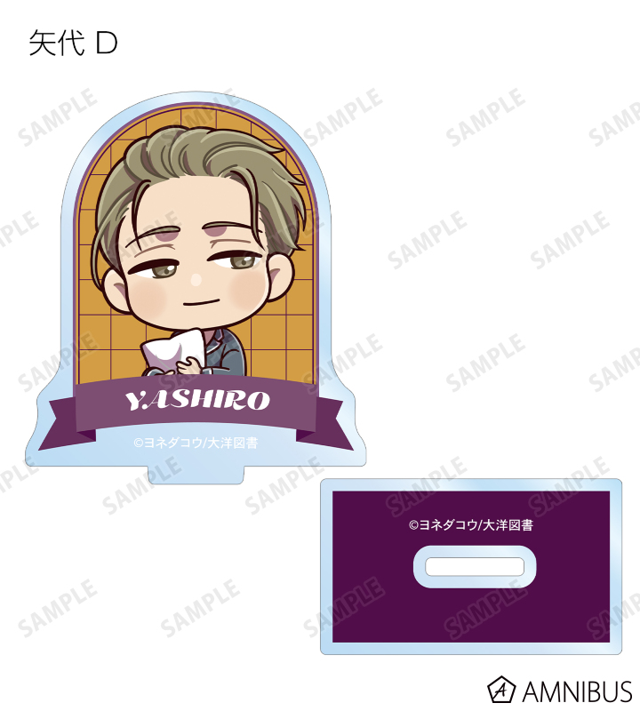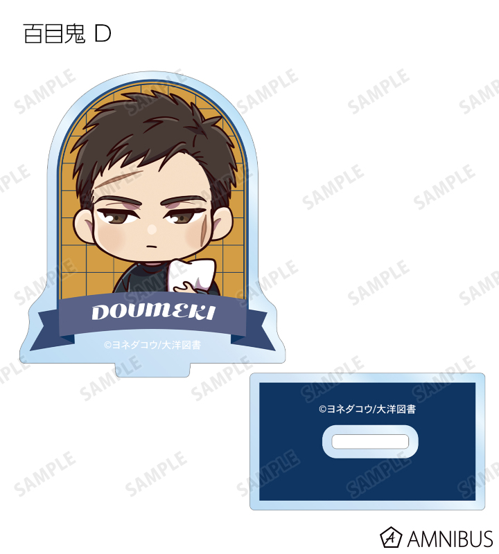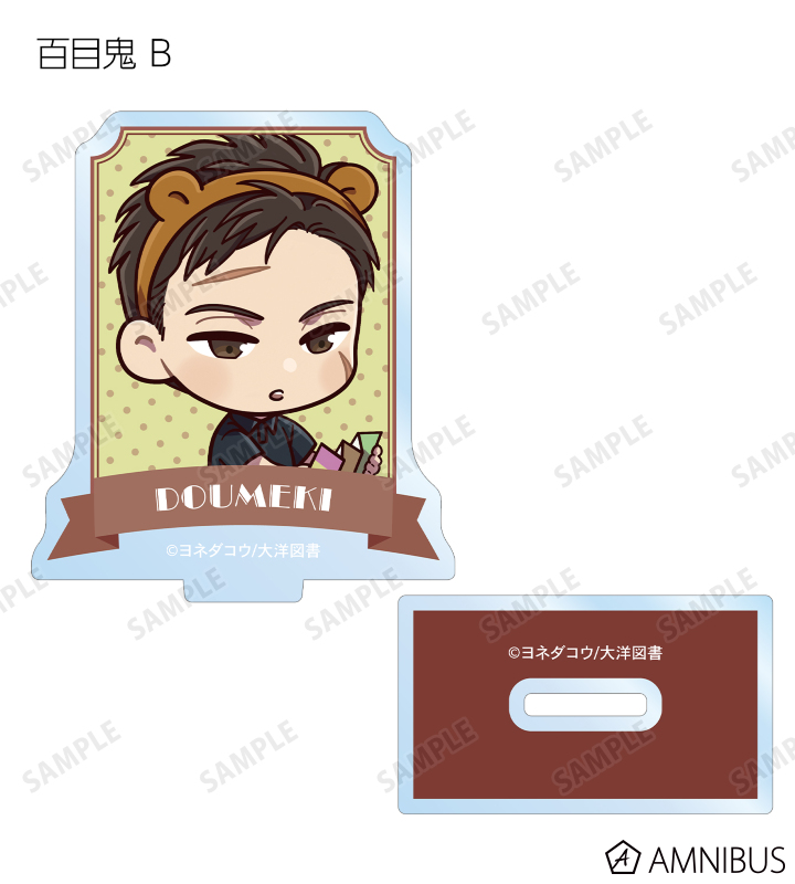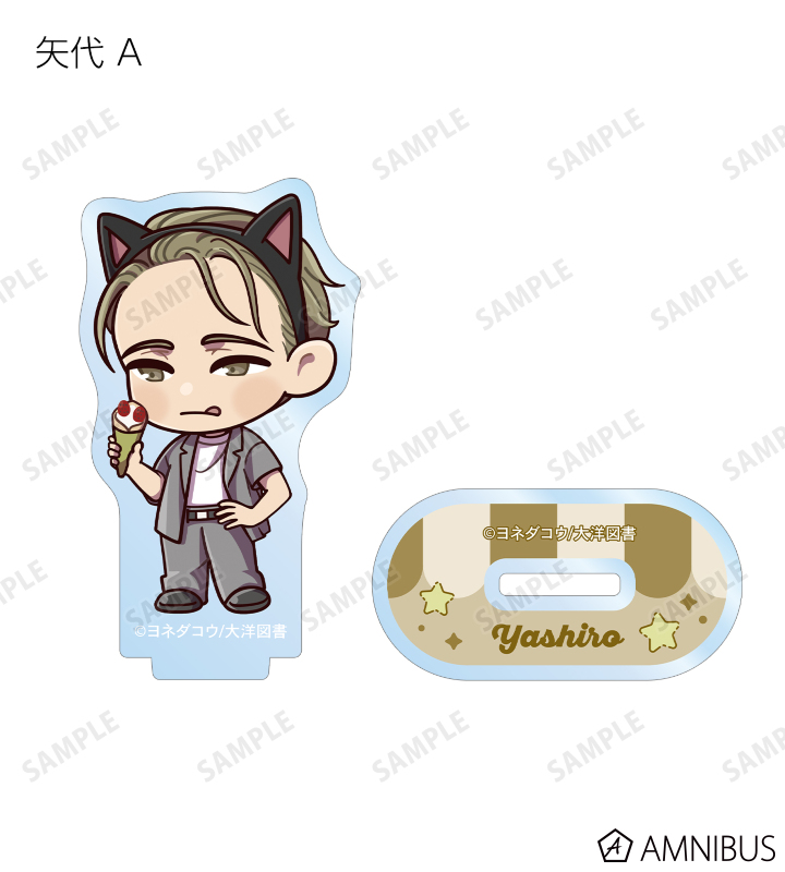 矢代、百目鬼の描き起こしちびキャライラストをメインにデザインし、アクリルスタンドに仕上げました。