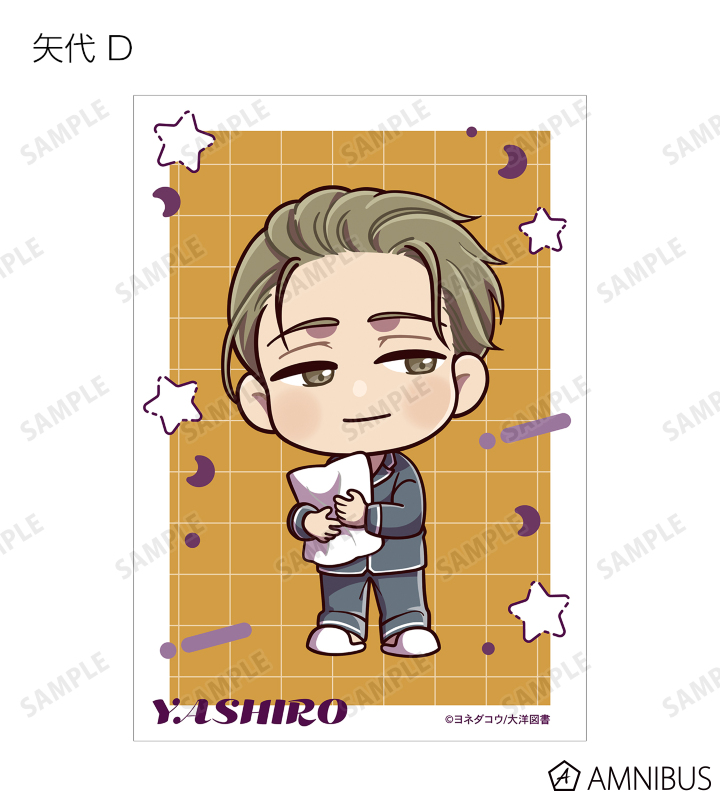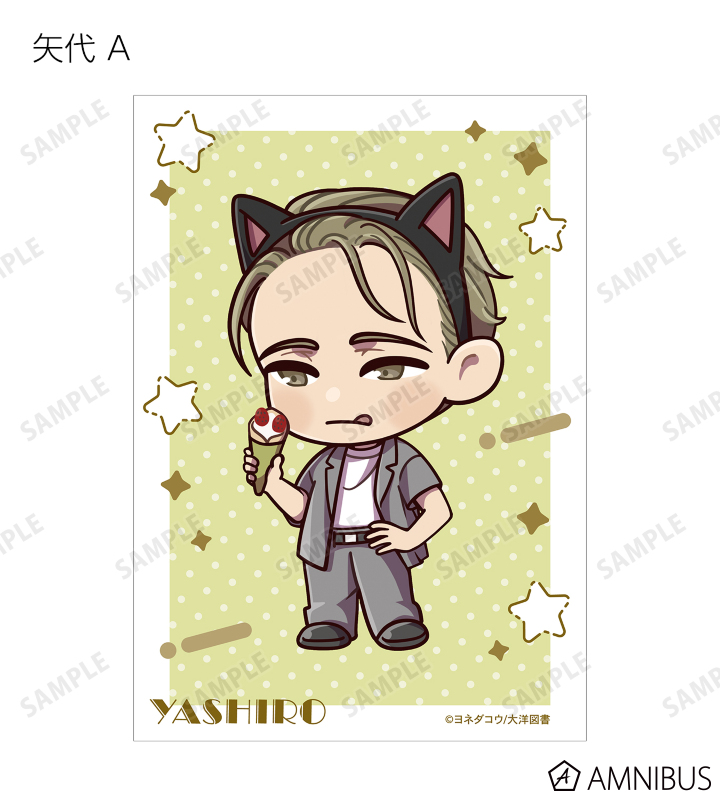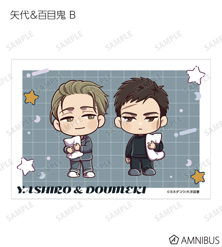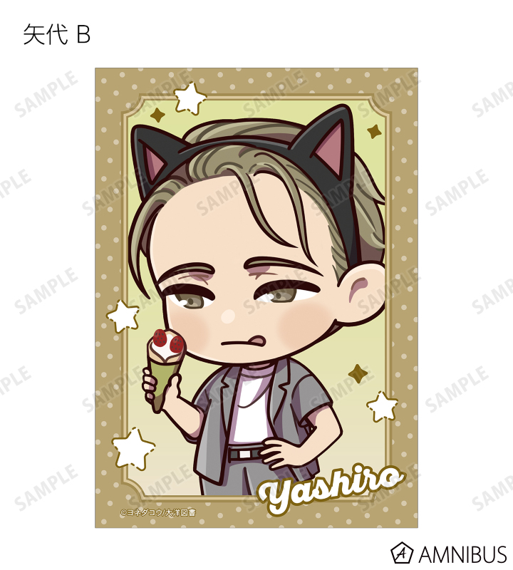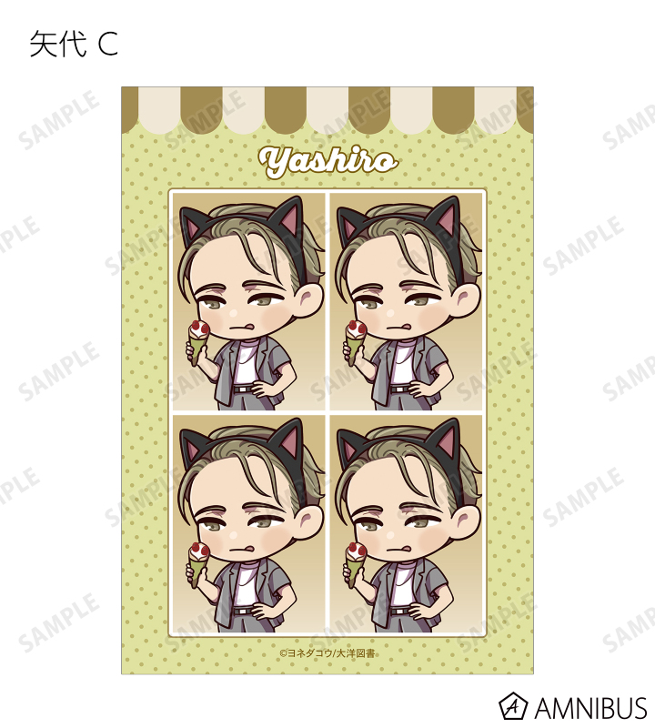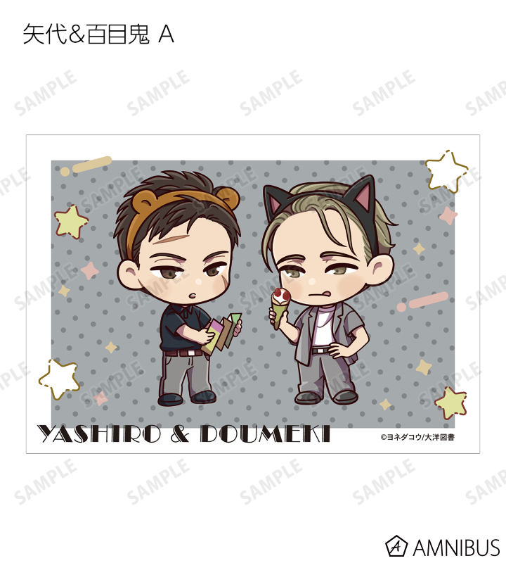 矢代、百目鬼の描き起こしちびキャライラストをメインにデザインし、ブロマイドに仕上げました。