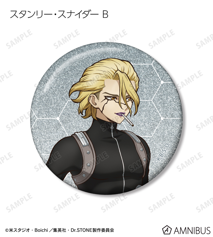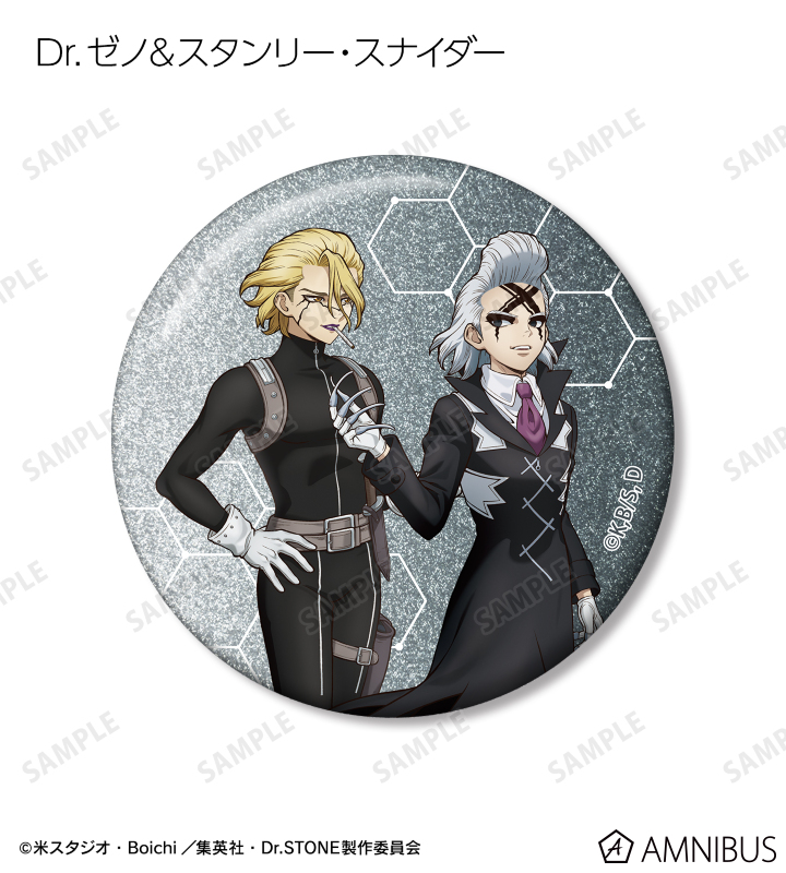 石神千空、あさぎりゲン、七海龍水、西園寺羽京、Dr.ゼノ、スタンリー・スナイダーの描き下ろしイラストをグリッター加工を施した缶バッジに仕上げました。