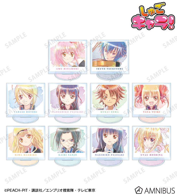 日奈森 あむ、月詠 イクト、辺里 唯世、藤咲 なでしこ、相馬 空海、結木 やや、真城 りま、三条 海里、藤咲 なぎひこ、ほしな 歌唄のイラストを新たなタッチで魅力的に表現し、アクリルスタンドに仕上げました。