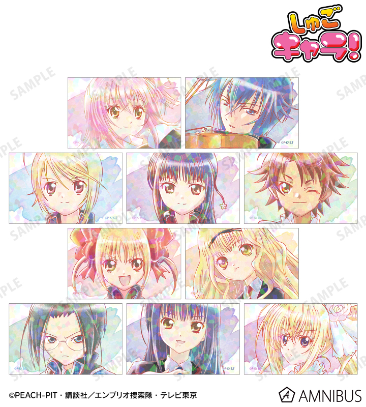 日奈森 あむ、月詠 イクト、辺里 唯世、藤咲 なでしこ、相馬 空海、結木 やや、真城 りま、三条 海里、藤咲 なぎひこ、ほしな 歌唄のイラストを新たなタッチで魅力的に表現し、ホログラム加工を施したイラストカードに仕上げました。