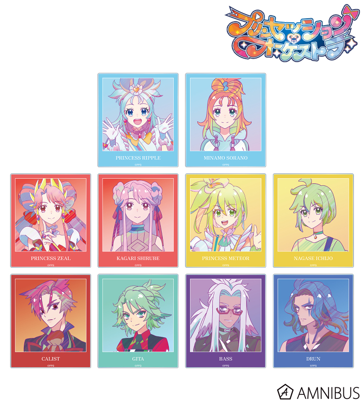 プリンセス・リップル、空野 みなも、プリンセス・ジール、識辺 かがり、プリンセス・ミーティア、一条 ながせ、カリスト、ギータ、ベス、ドランのイラストを新たなタッチで魅力的に表現し、アクリルカードに仕上げました。