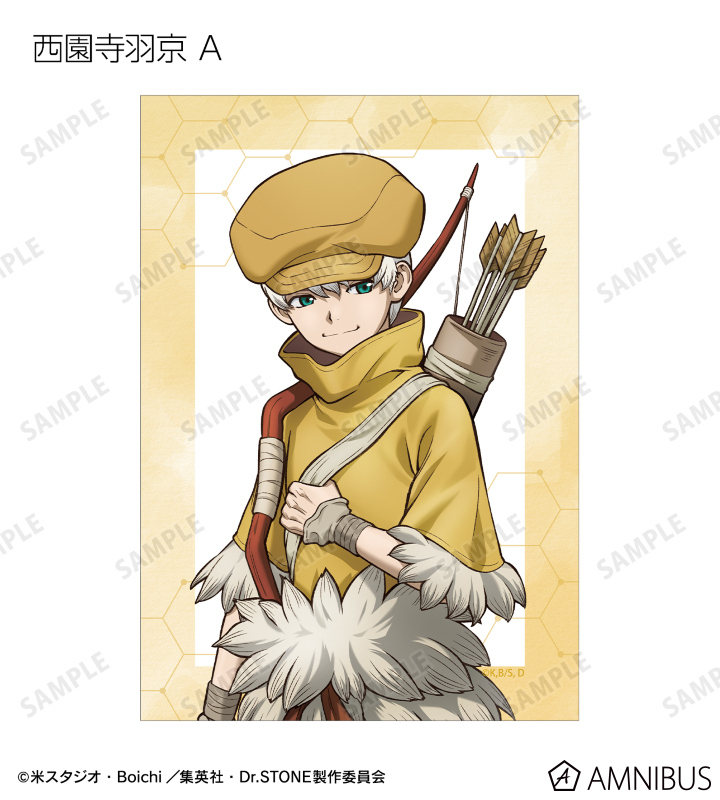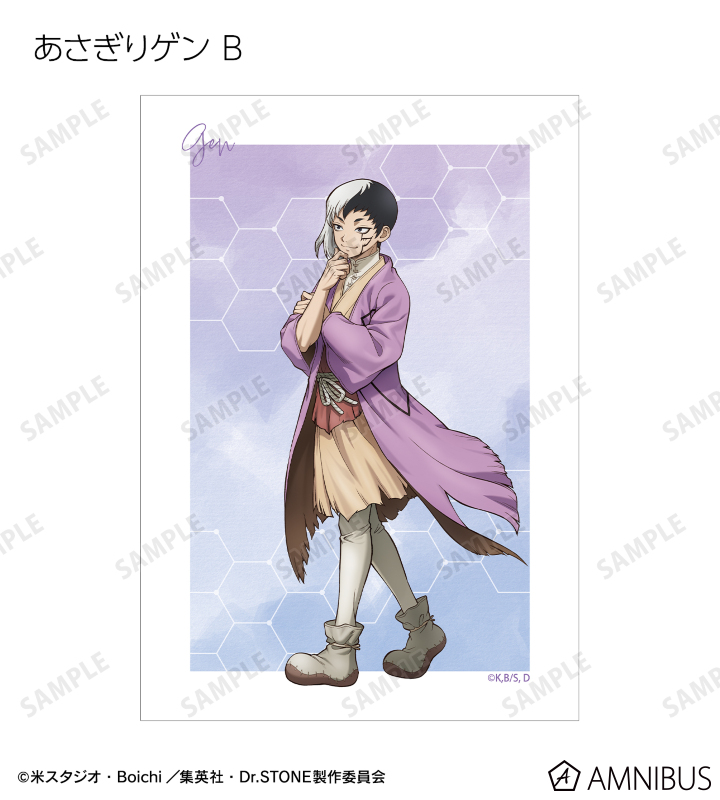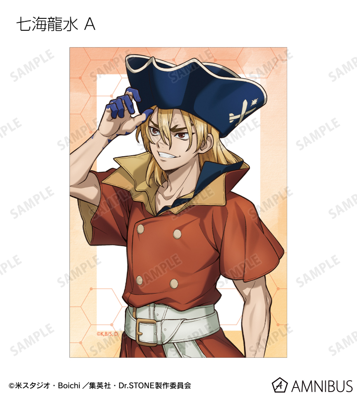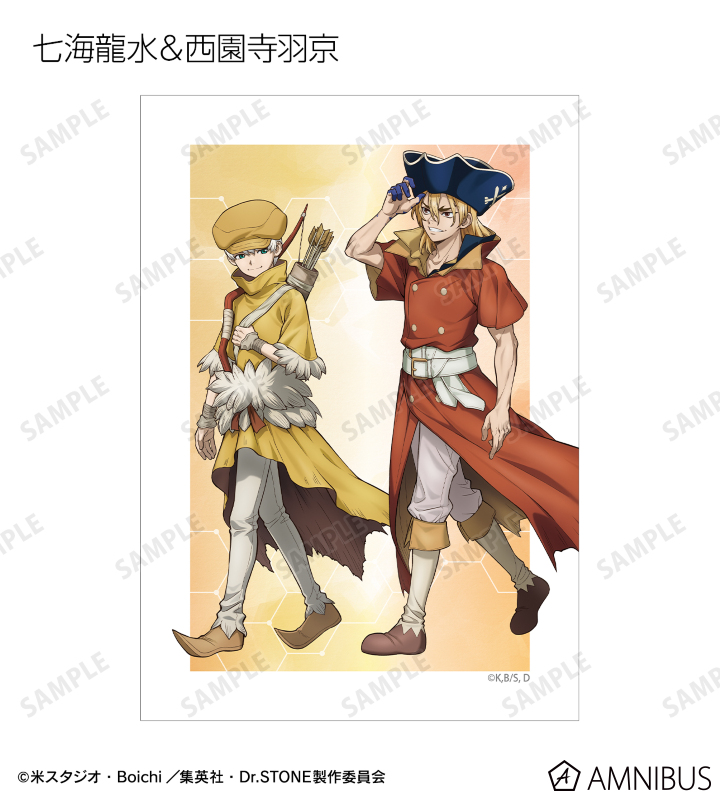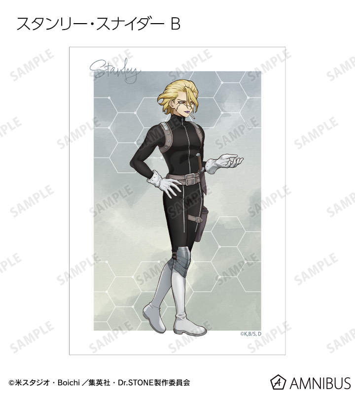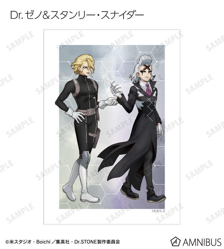 石神千空、あさぎりゲン、七海龍水、西園寺羽京、Dr.ゼノ、スタンリー・スナイダーの描き下ろしイラストをブロマイドに仕上げました。