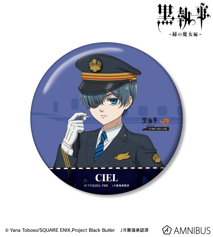 アニメ『黒執事 -緑の魔女編-』×「推し旅/JR東海」のコラボレーションアイテム「描き下ろし シエル・ファントムハイヴ 駅員ver. 100mm缶バッジ」の登場です。