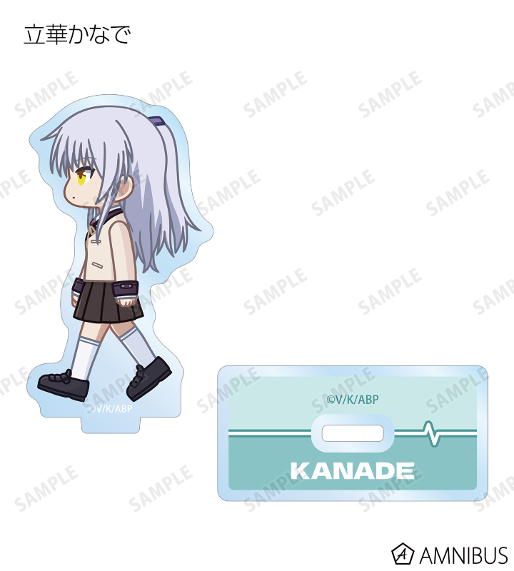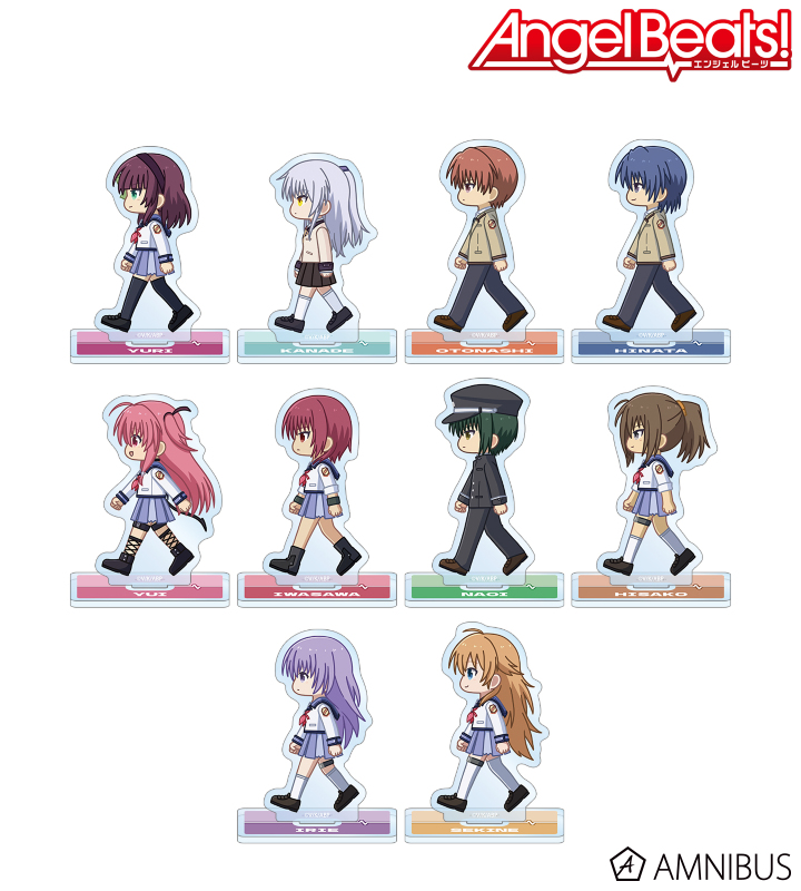 仲村ゆり、立華かなで、音無結弦、日向秀樹、ユイ、岩沢雅美、直井文人、ひさ子、入江、関根が歩いているちびキャラを新たに描き起こし、アクリルスタンドに仕上げました。