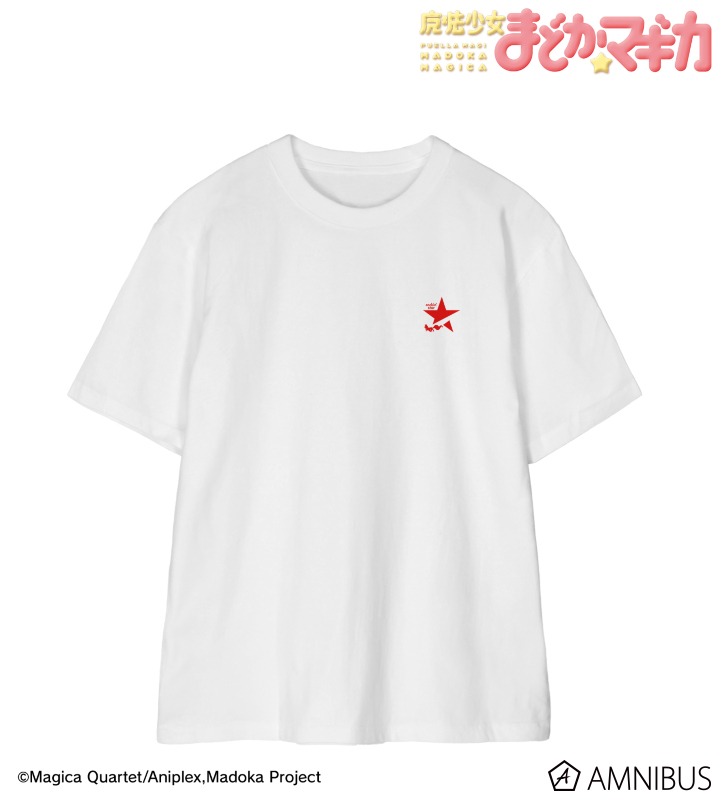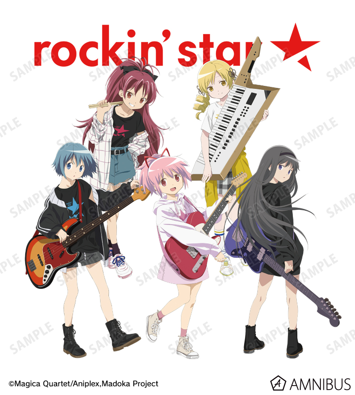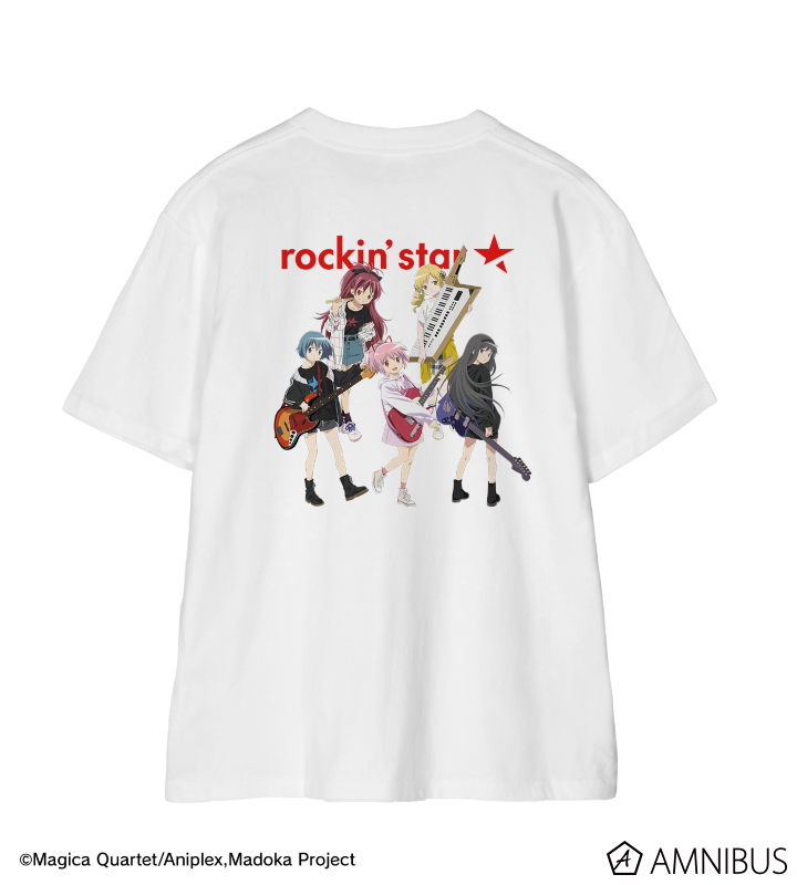 鹿目まどか、暁美ほむら、巴マミ、美樹さやか、佐倉杏子の描き下ろしイラスト、rockin’star★のロゴをTシャツに仕上げました。