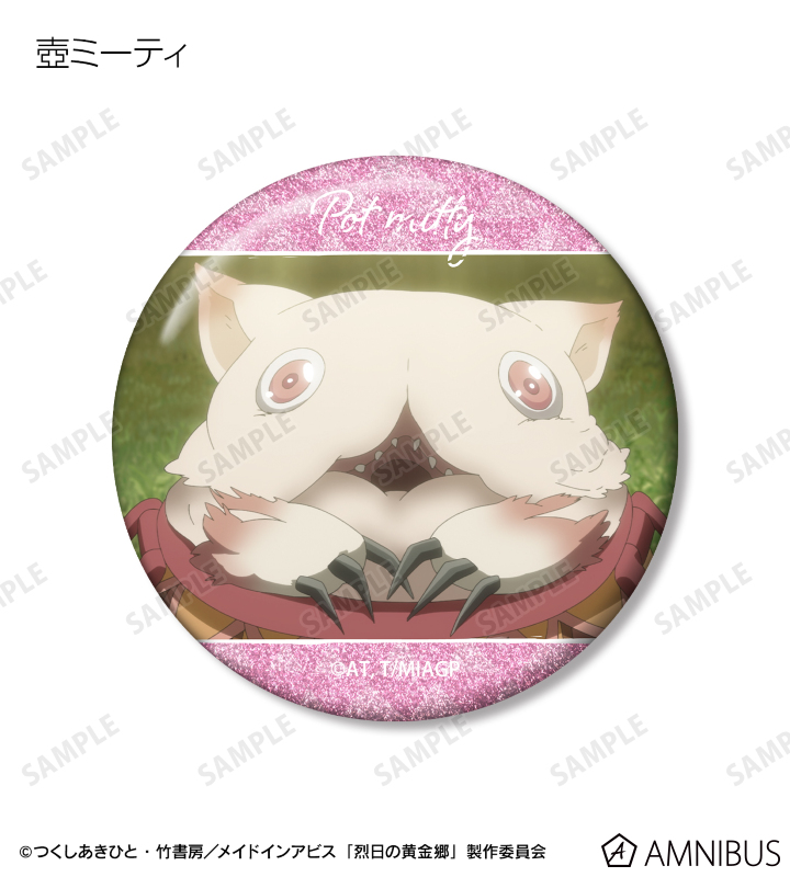 リコ、レグ、ナナチ、ファプタ、ヴエコ、ワズキャン、ベラフ、イルミューイ、壺ミーティ、マアアさんの印象的なシーンをグリッター加工を施した缶バッジに仕上げました。