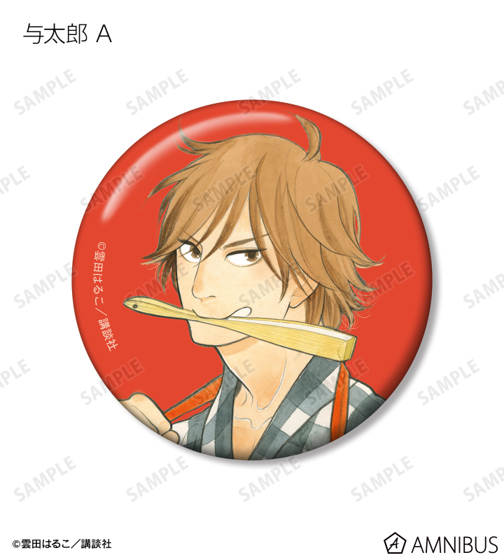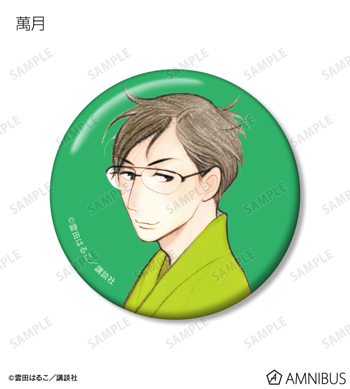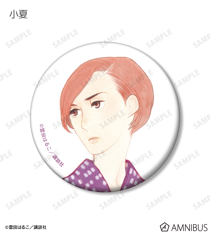 与太郎、八雲、菊比古、信之助、小夏、松田さん、樋口、萬月、助六、みよ吉のカラーイラストを缶バッジに仕上げました。