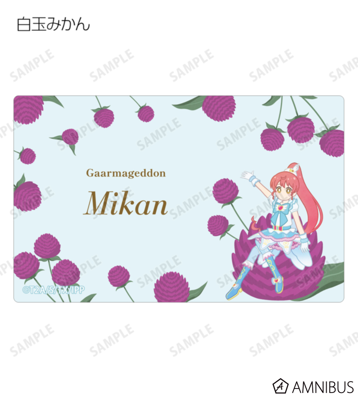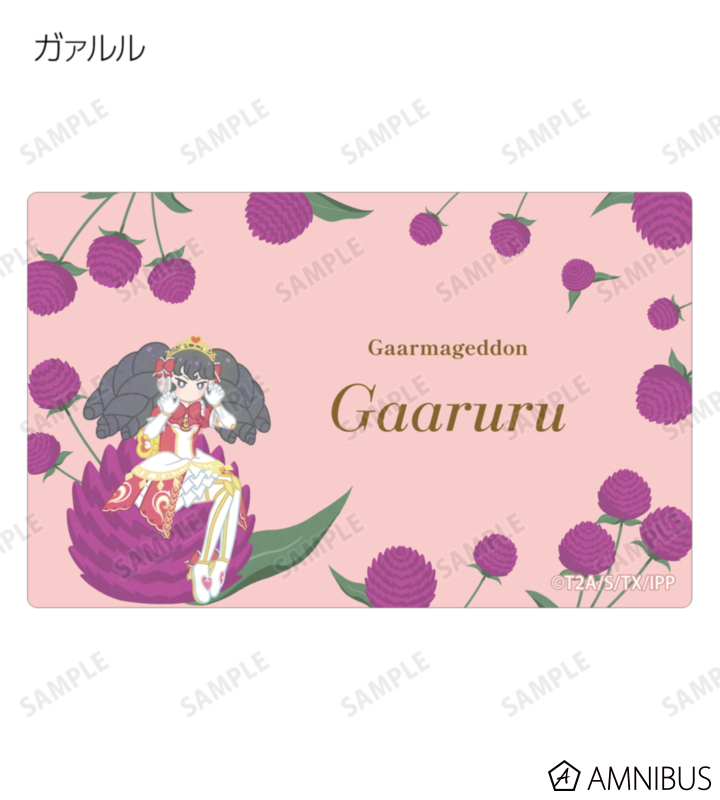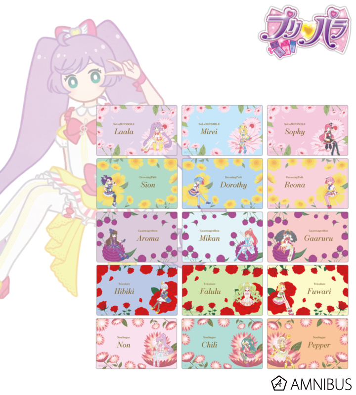 真中らぁら、南みれぃ、北条そふぃ、東堂シオン、ドロシー・ウェスト、レオナ・ウェスト、黒須あろま、白玉みかん、ガァルル、紫京院ひびき、ファルル、緑風ふわり、真中のん、月川ちり、太陽ペッパーのイラストをボタニカルデザインに落とし込んで繊細なタッチで新たに描き起こし、カードステッカーに仕上げました。