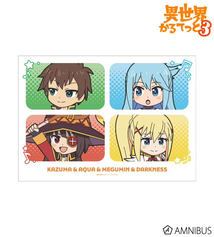 カズマ、アクア、めぐみん、ダクネスのイラストをA3サイズのマット加工されたポスターに仕上げました。