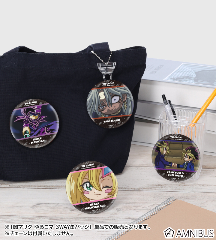 闇マリクの印象的なシーンをそのままデフォルメで再現し、3WAY缶バッジに仕上げました。
