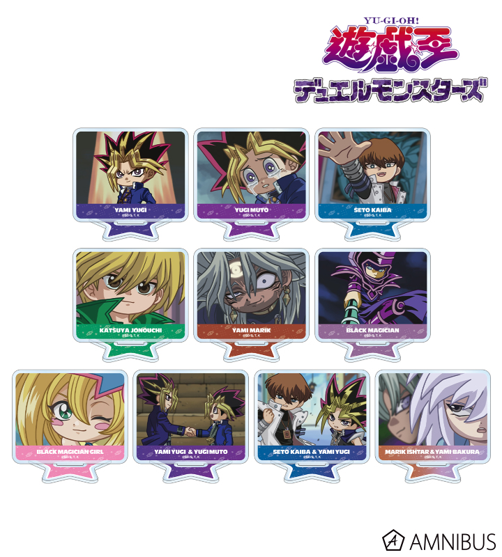 闇遊戯、武藤遊戯、海馬瀬人、城之内克也、闇マリク、ブラック・マジシャン、ブラック・マジシャン・ガール、マリク・イシュタール、闇バクラの印象的なシーンをそのままデフォルメで再現し、アクリルスタンドに仕上げました。