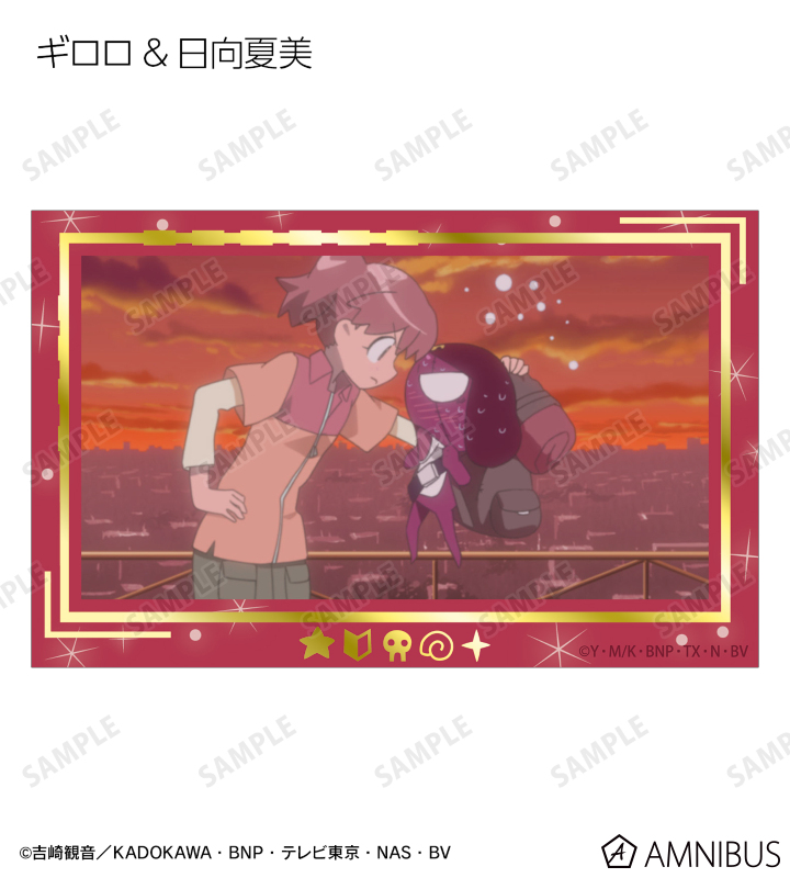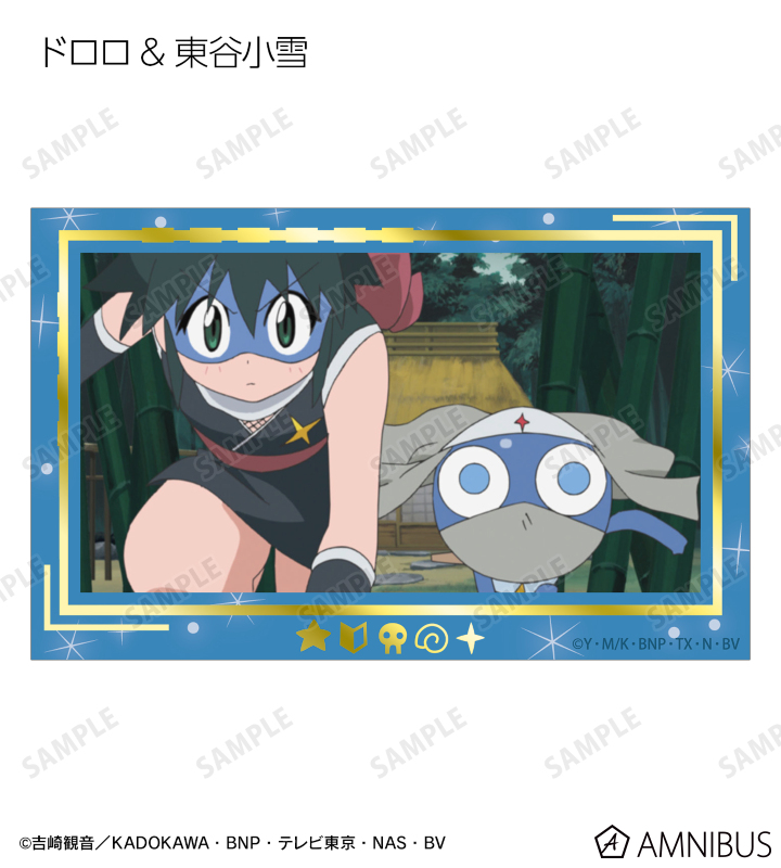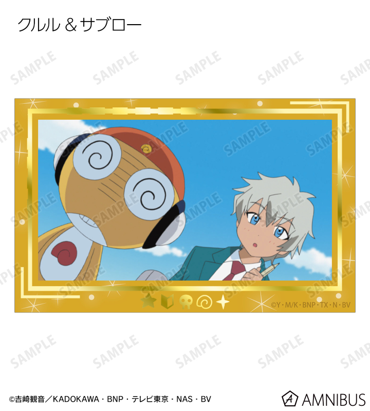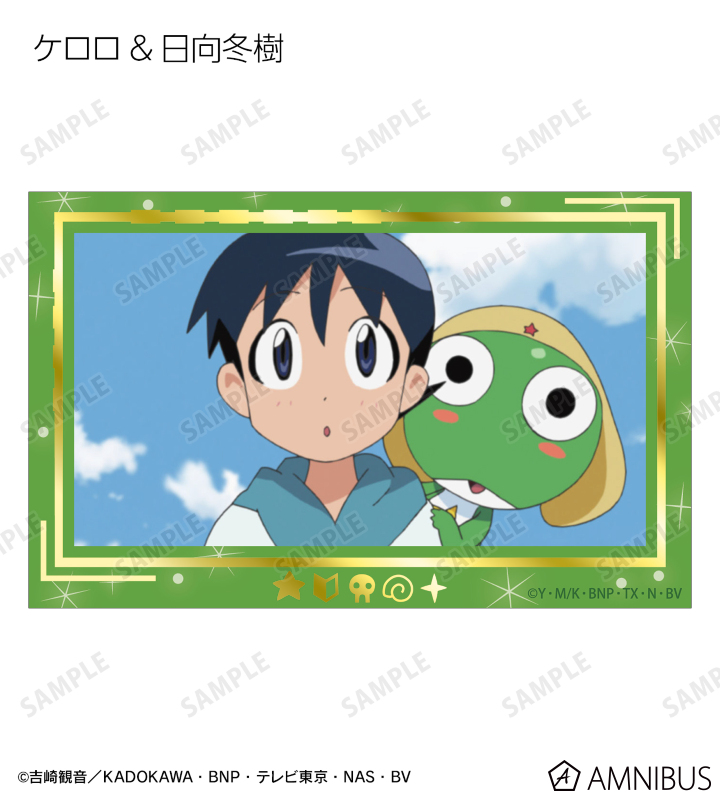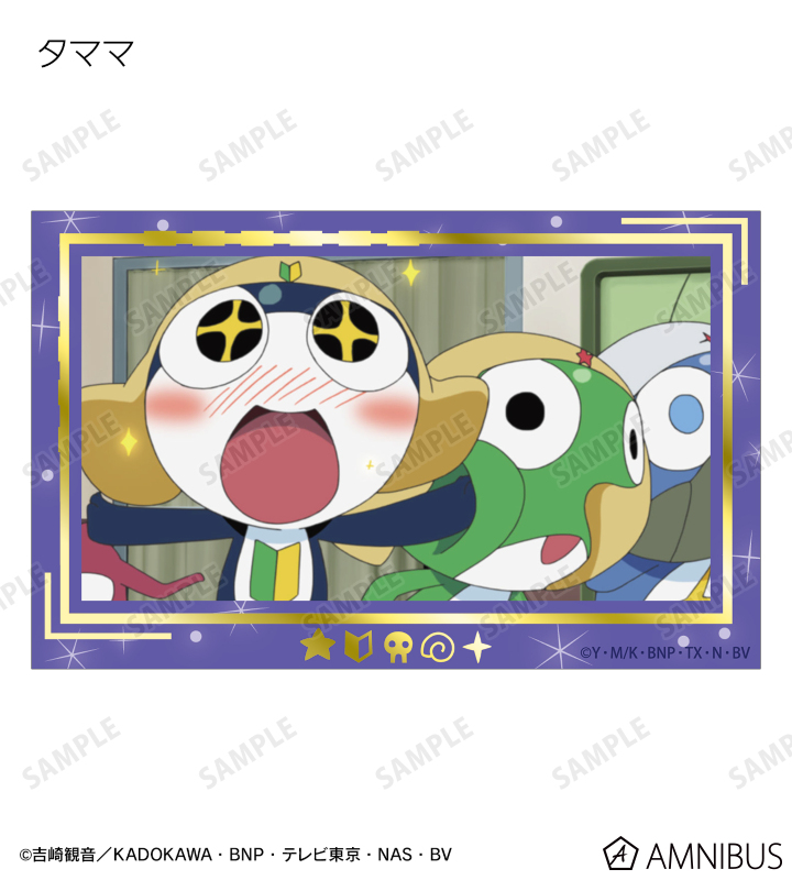 ケロロ、タママ、ギロロ、クルル、ドロロ、日向 冬樹、日向 夏美、西澤 桃華、サブロー、東谷 小雪の印象的なシーンを箔押し加工が施されたカードに仕上げました。