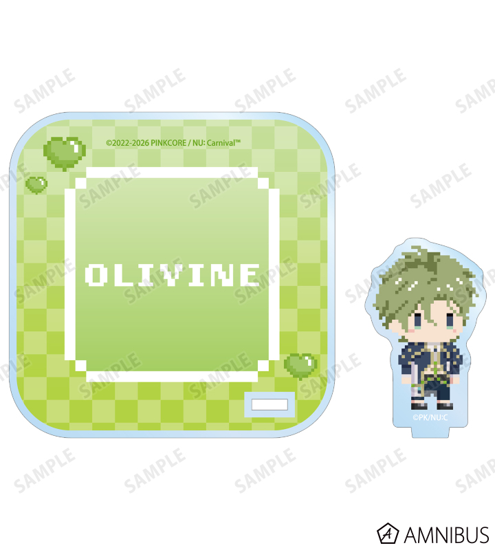 オリビンの描き起こしドット風ちびキャライラストをメインにデザインし、アクリルスタンド付きコースターに仕上げました。
