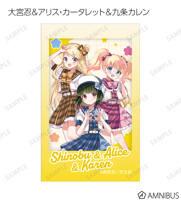 原悠衣先生描き下ろしイラストの大宮忍、アリス・カータレット、小路綾、猪熊陽子、九条カレンをイラストカードに仕上げました。