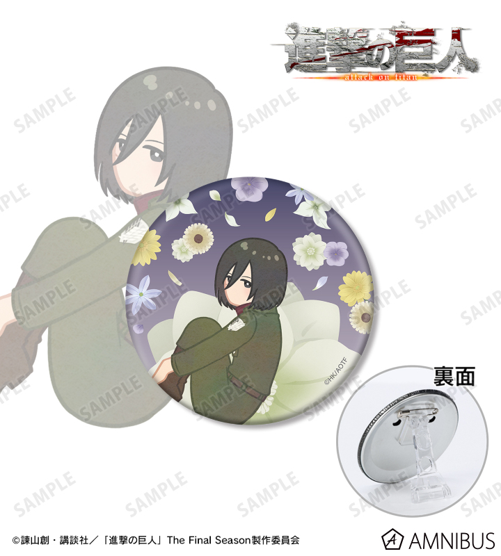 ミカサのイラストをボタニカルデザインに落とし込んで繊細なタッチで新たに描き起こし、3WAY缶バッジに仕上げました。