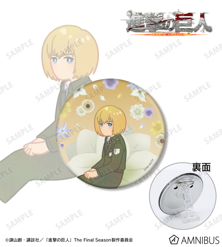 アルミンのイラストをボタニカルデザインに落とし込んで繊細なタッチで新たに描き起こし、3WAY缶バッジに仕上げました。