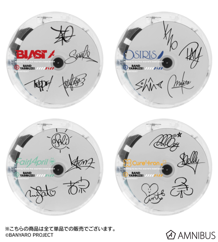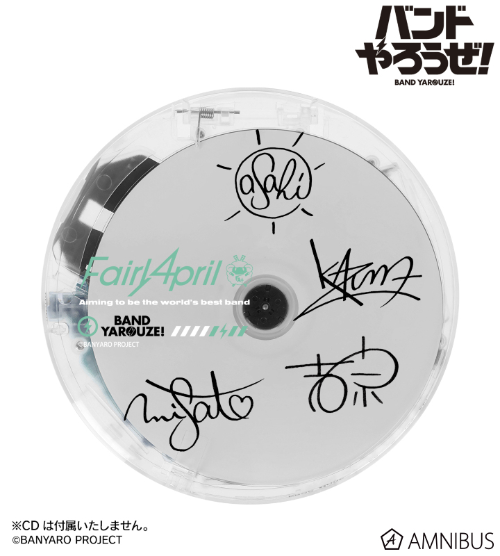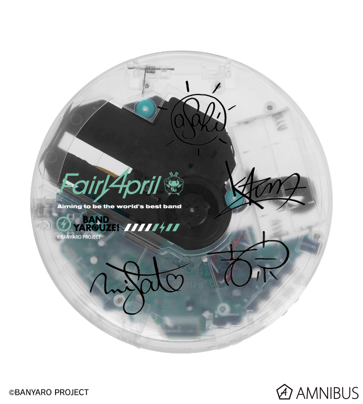 Fairy Aprilのロゴ、作品ロゴ、「目指すものはバンドの頂点」の英字、鳳 葵陽、七瀬一真、徳田吉宗、藤堂美郷のサインをポータブルクリアCDプレーヤーに仕上げました。