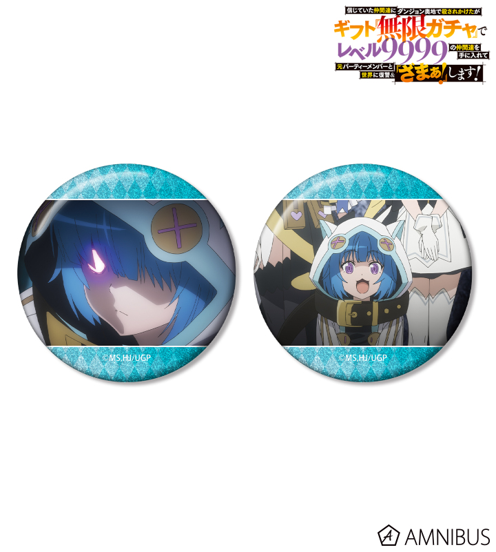 TVアニメ『信じていた仲間達にダンジョン奥地で殺されかけたがギフト『無限ガチャ』でレベル9999の仲間達を手に入れて元パーティーメンバーと世界に復讐&『ざまぁ!』します!』より、グリッター缶バッジ2個セットの登場です。