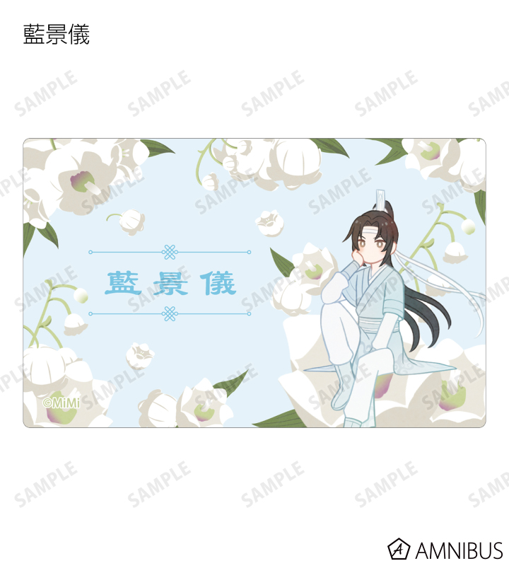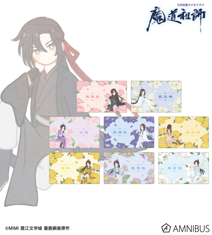 魏無羨、藍忘機、江澄、藍曦臣、金光瑤、金凌、藍思追、藍景儀のイラストをボタニカルデザインに落とし込んで繊細なタッチで新たに描き起こし、カードステッカーに仕上げました。