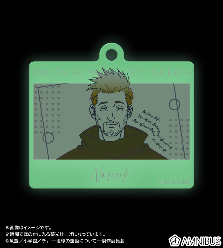 ノヴァクのイラストを文字と混ぜ合わせ、新たに描き起こし、暗所で発光する蓄光のアクリルにデザインしてアクリルキーホルダーに仕上げました。