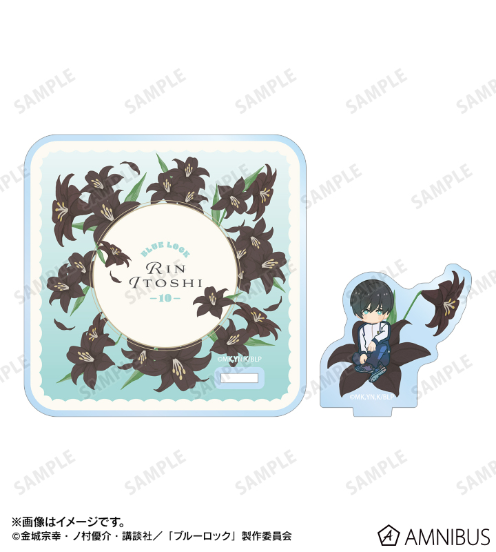 糸師 凛のイラスト、各キャラクターをイメージした花をボタニカルデザインに落とし込んで繊細なタッチで新たに描き起こし、アクリルスタンド付きコースターに仕上げました。