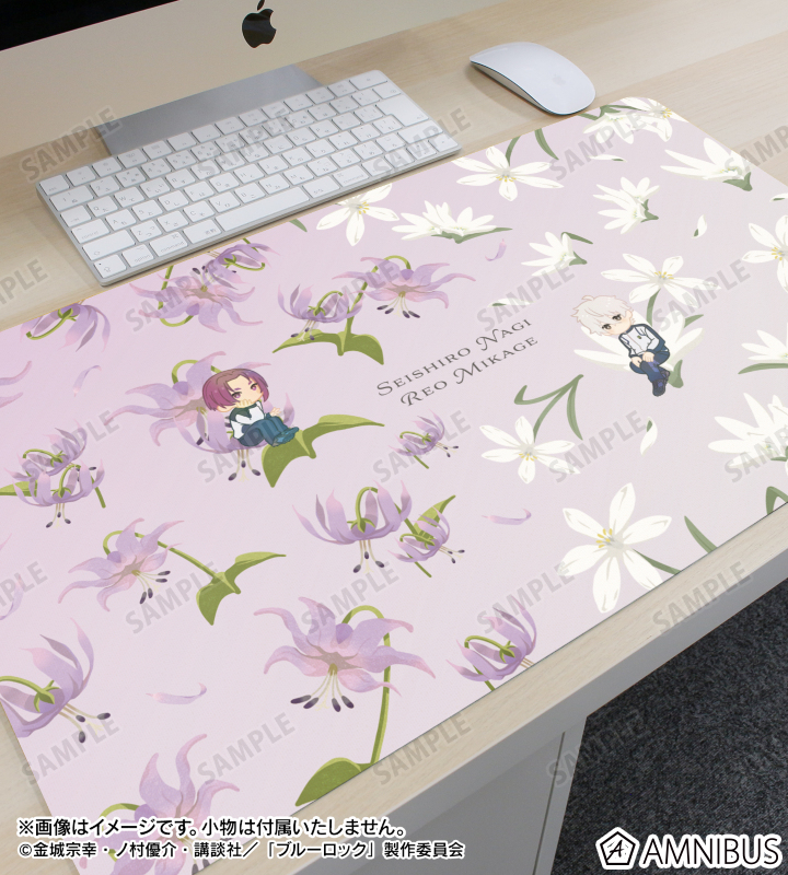 凪 誠士郎、御影 玲王のイラスト、各キャラクターをイメージした花をボタニカルデザインに落とし込んで繊細なタッチで新たに描き起こし、マルチデスクマットに仕上げました。